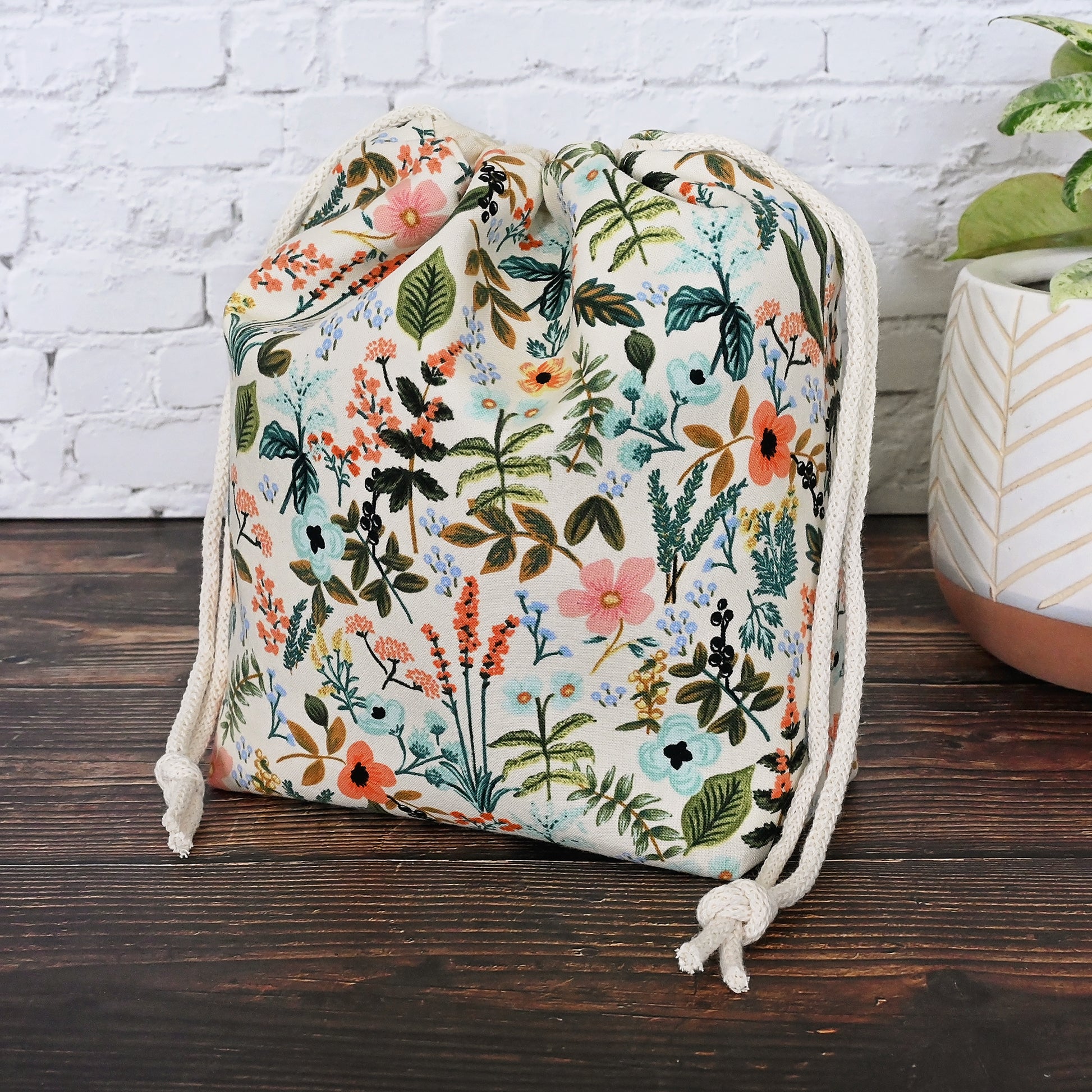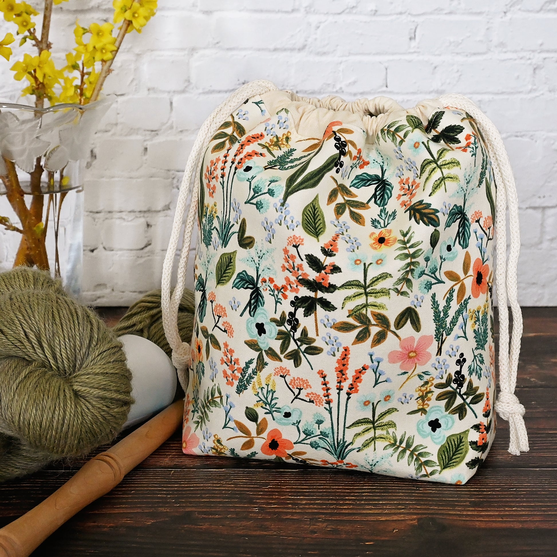 Made with Rifle Paper Co's popular Amalfi floral print and lined with a charming green spotted fabric by Dear Stella, this little project bag is perfect for sock knitting! It has convenient slip pockets, is lightly structured to stand alone and it closes securely with a double drawstring.