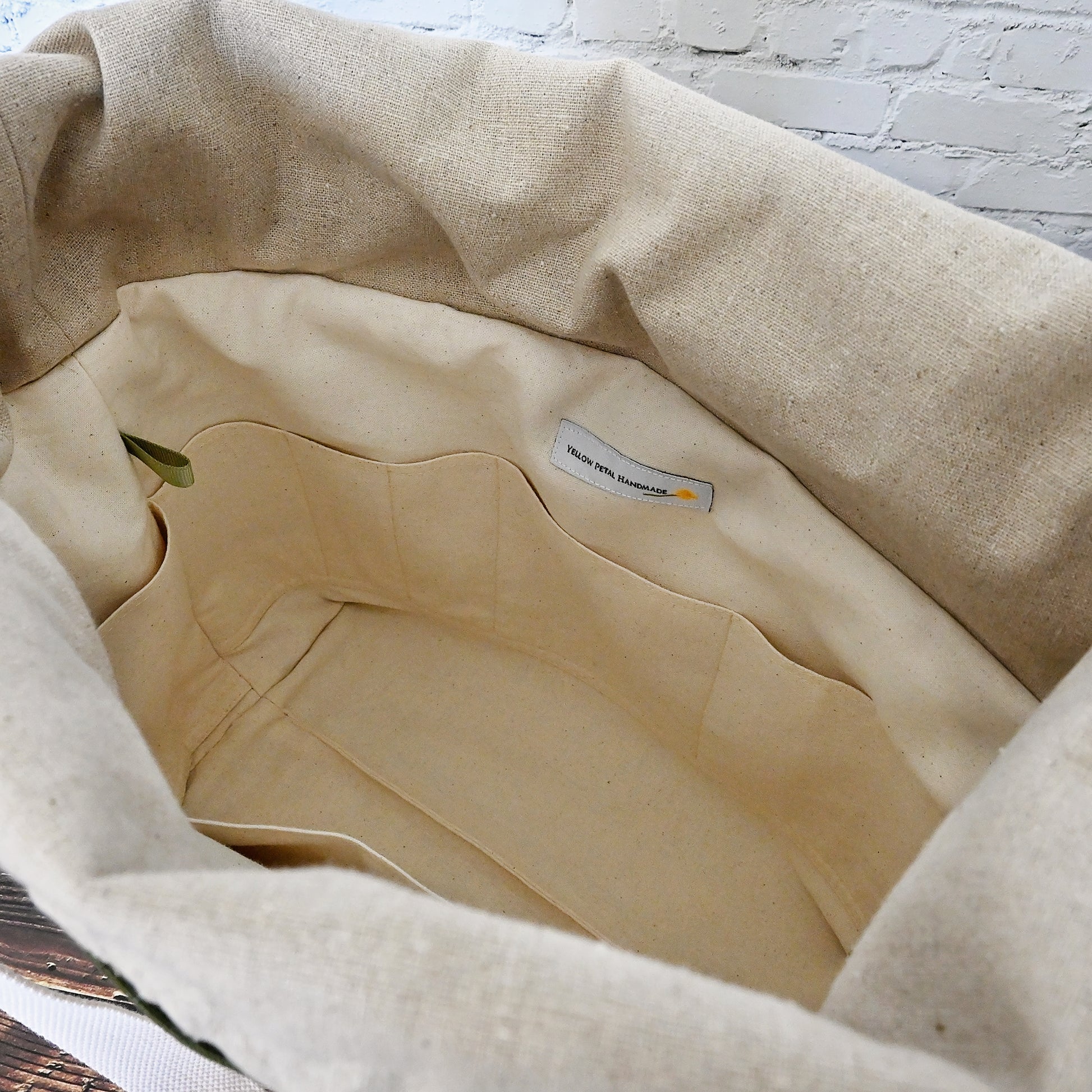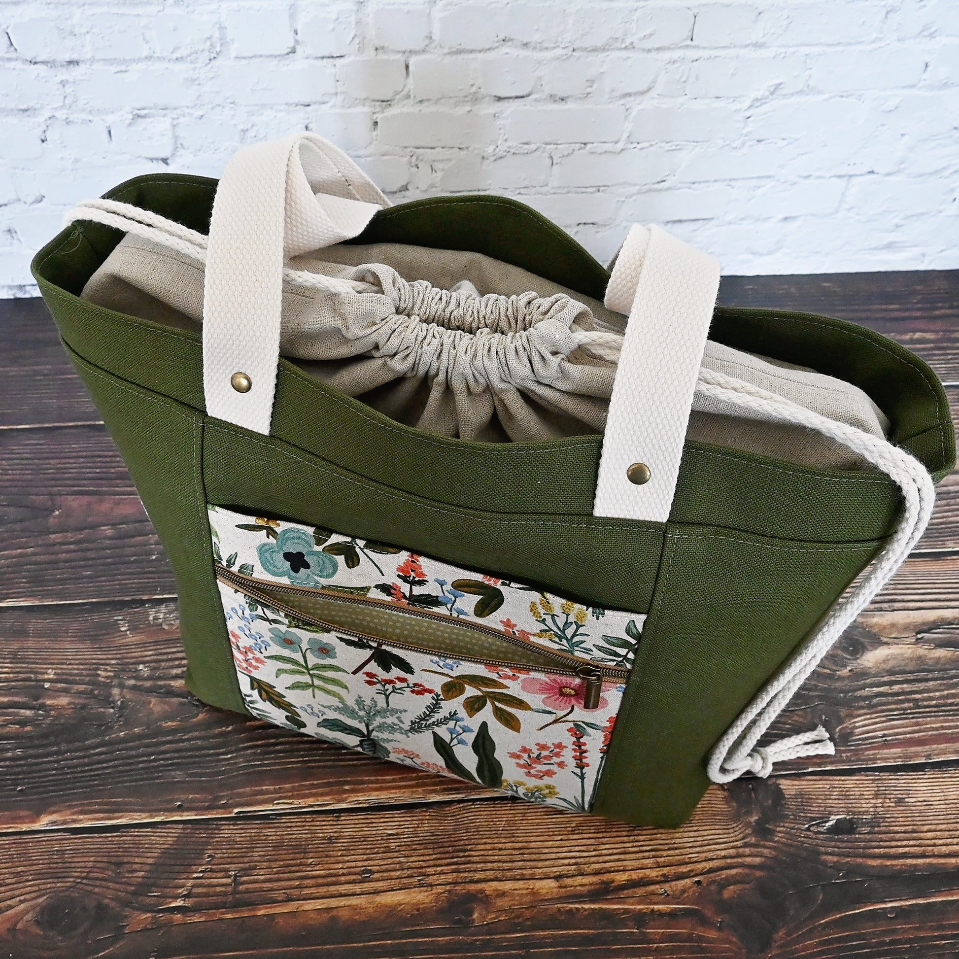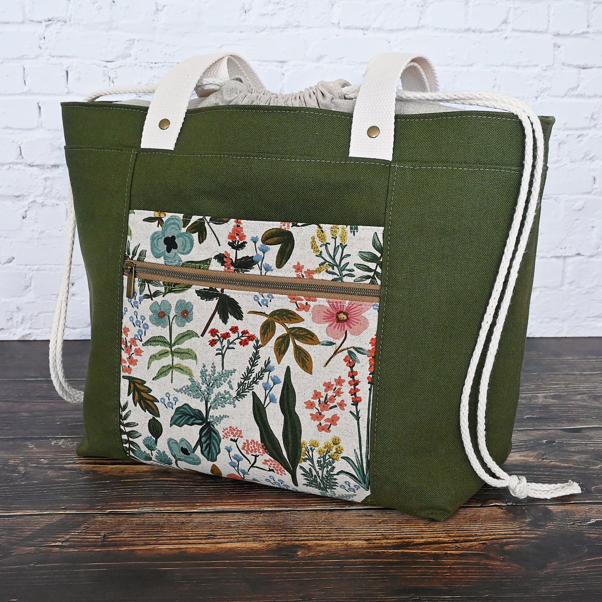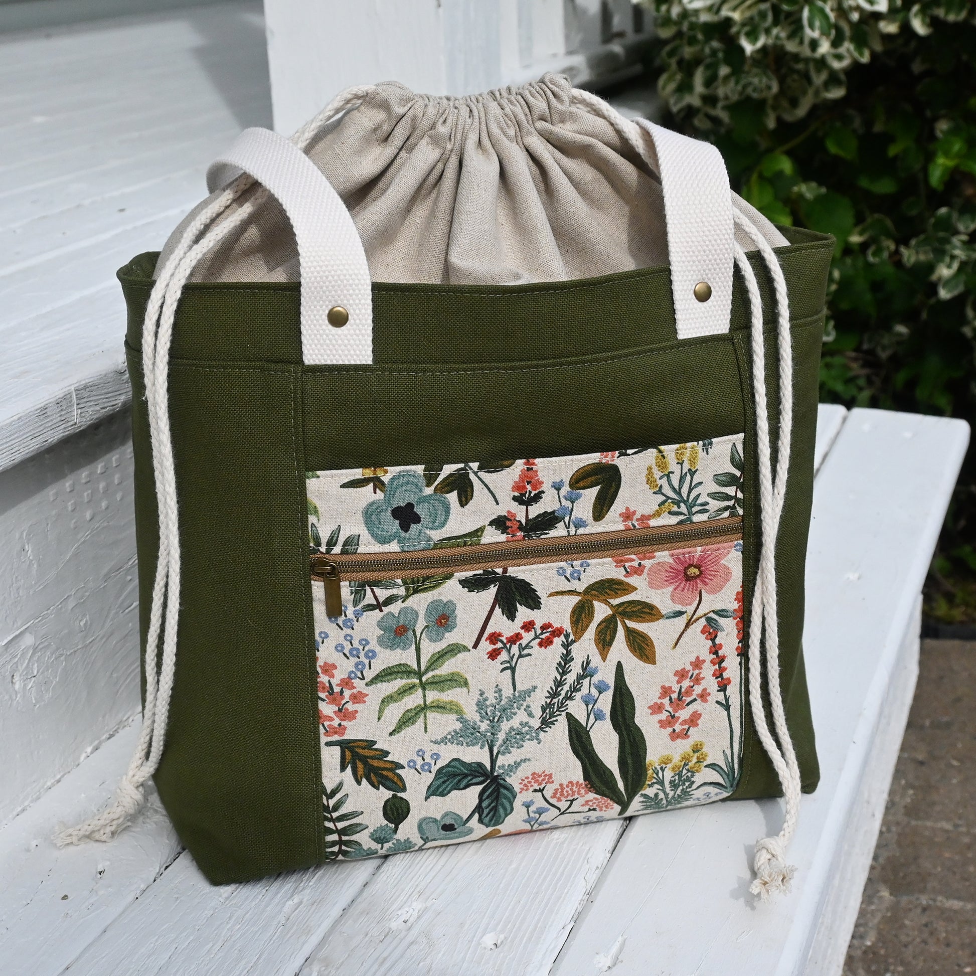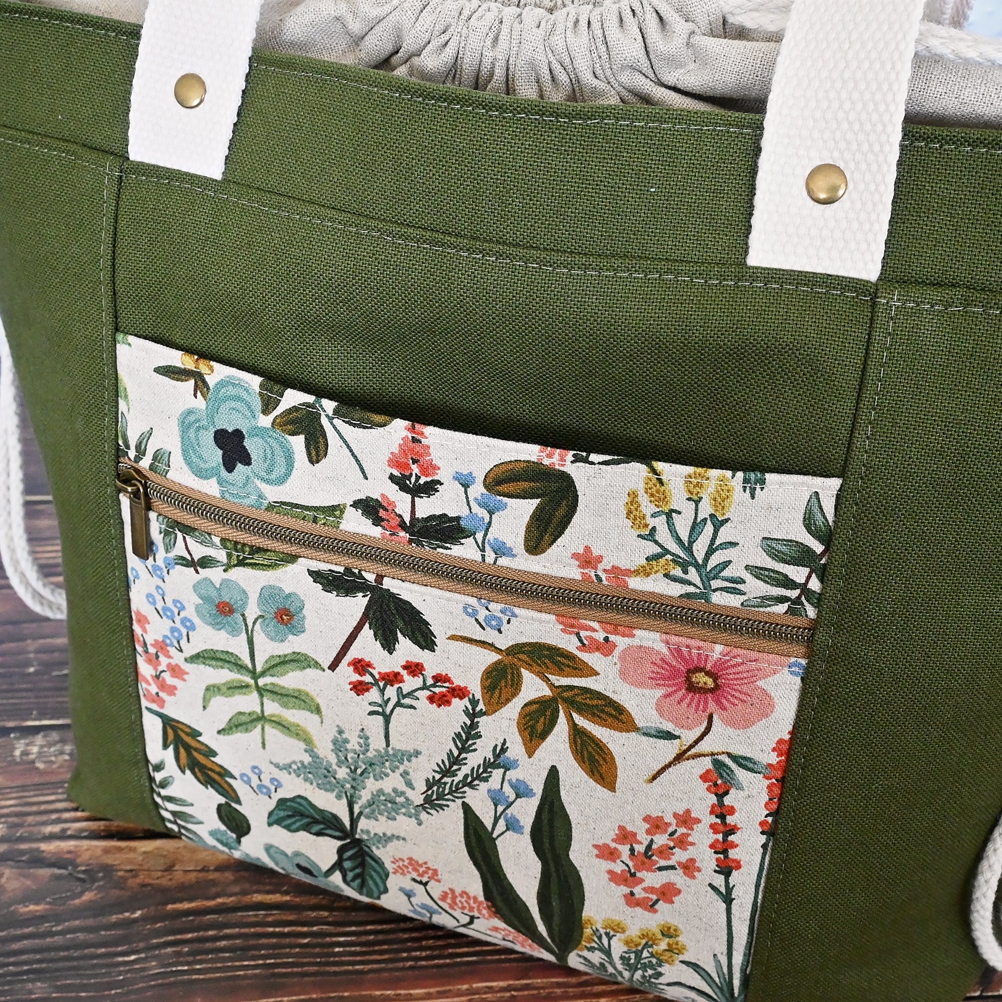 The Amalfi Project Tote is thoughtfully designed for makers who love both beauty and function. The exterior is made from a sturdy olive green cotton canvas and paired with a striking premium canvas in Rifle Paper Co's Amalfi. Β