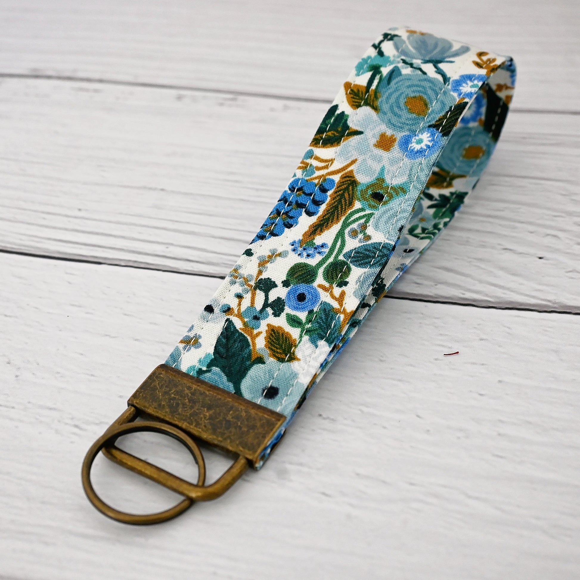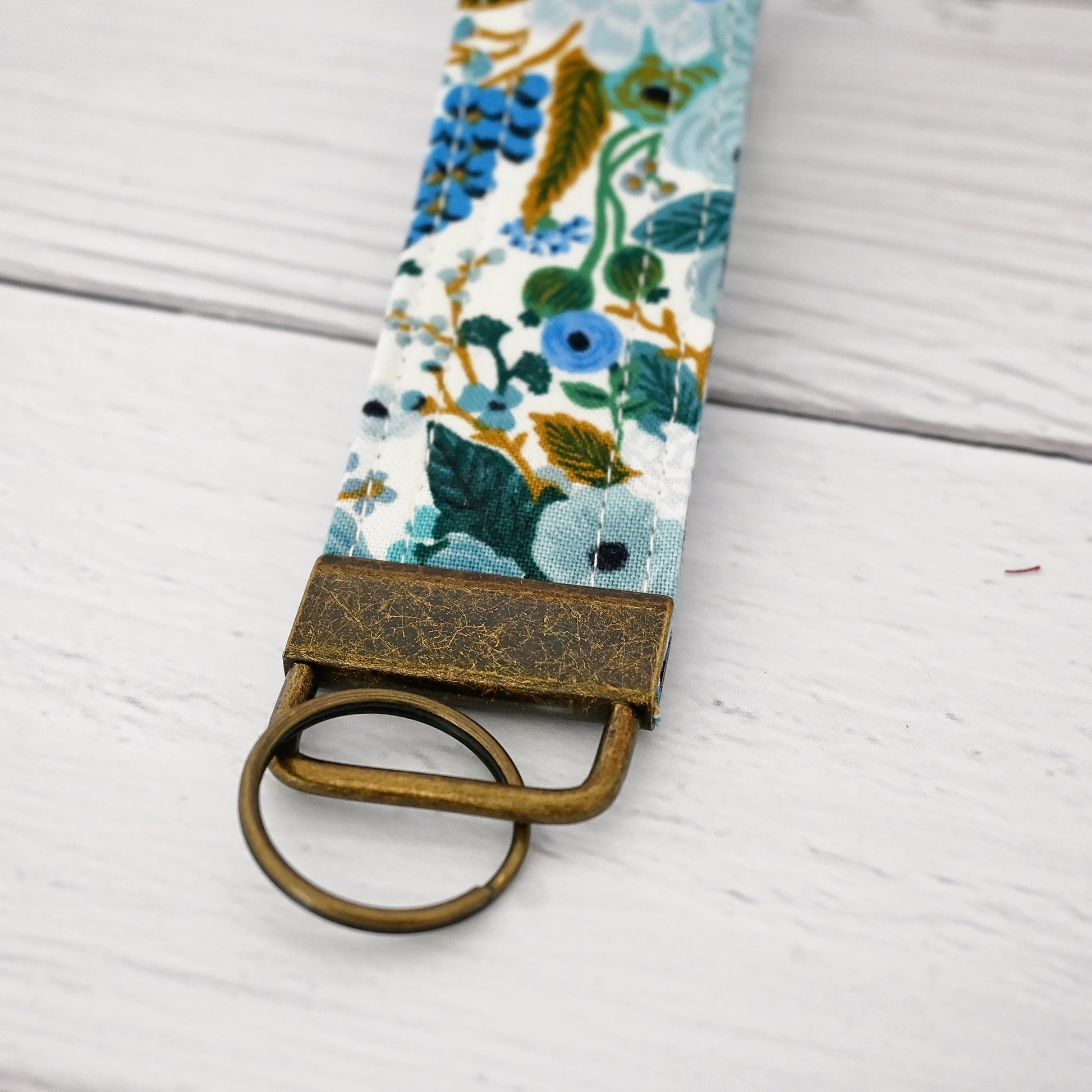 Pretty wristlet keychains available in a pretty blue floral from Rifle Paper Co. These keychains are 6" long by 1.25" wide and feature gold hardware. Fully reinforced for durability, these key fob wristlets are perfect for keeping your hands free while carrying your keys