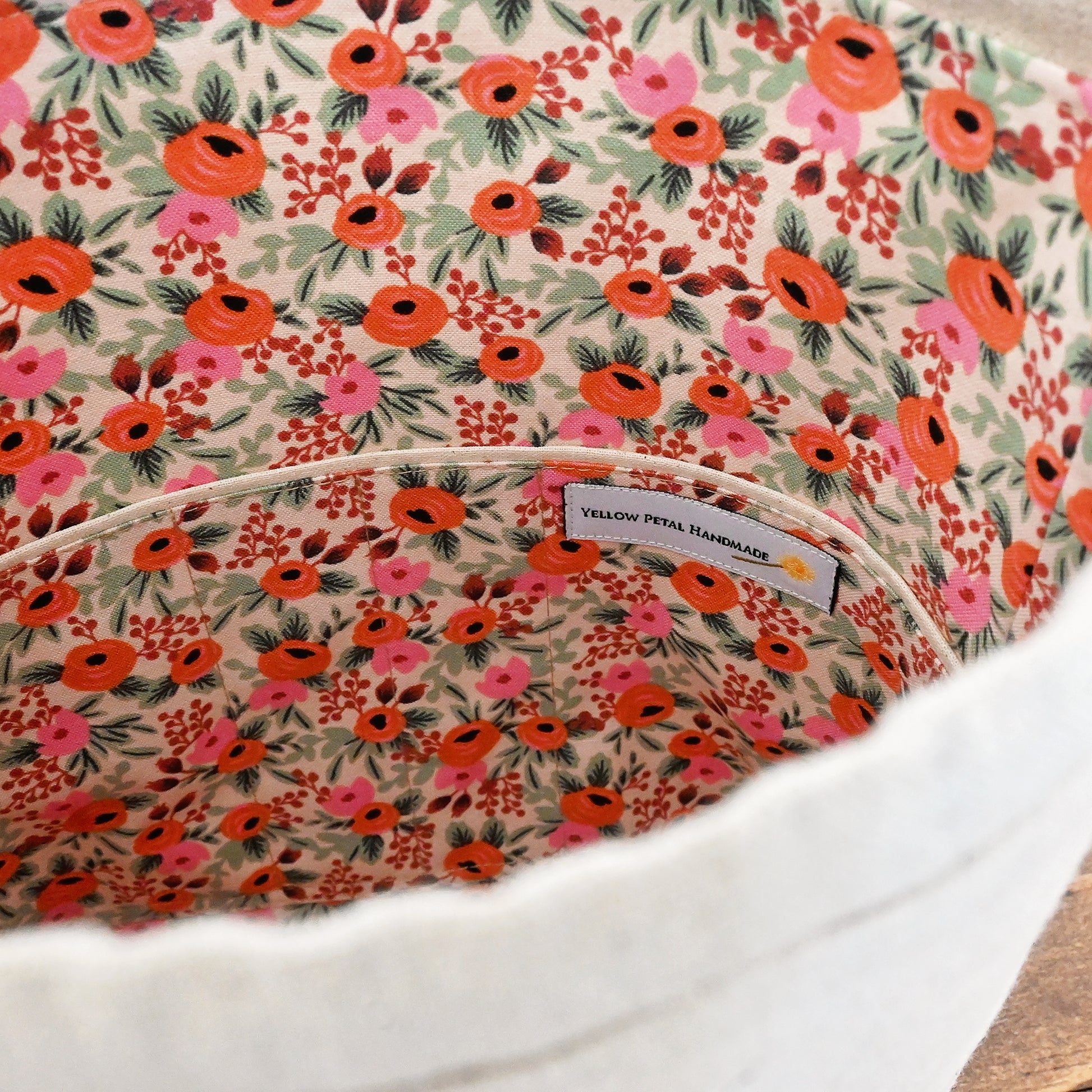 The exterior is a natural canvas by Robert Kaufman and the interior is a pretty Rosa floral from Rifle Paper Co.