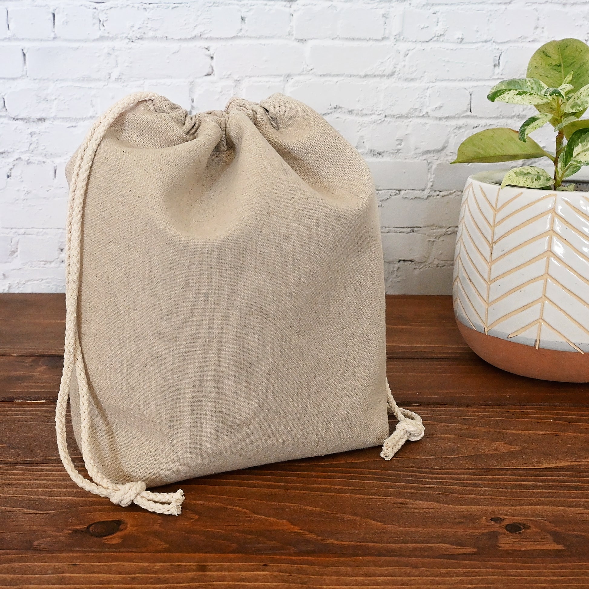 A natural canvas drawstring bag with a pretty coral and green floral lining. Perfect if you love a subtle, classic bag with an eye catching interior. This bag is lightly reinforced, and it closes securely with a double drawstring.