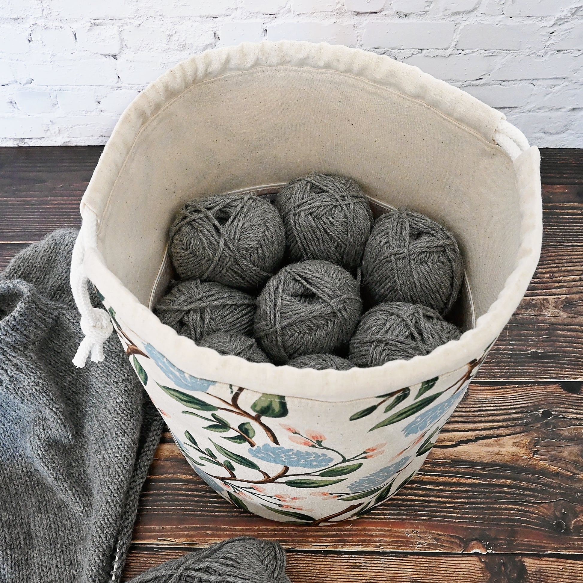 This drawstring knitting or crochet project bag is made from Rifle Paper Co's Peonies canvas. It has multiple pockets and a light layer of interfacing so that it stands alone, making it easy to reach into the bag while you're working.  This bag is perfect for medium to large sized projects.