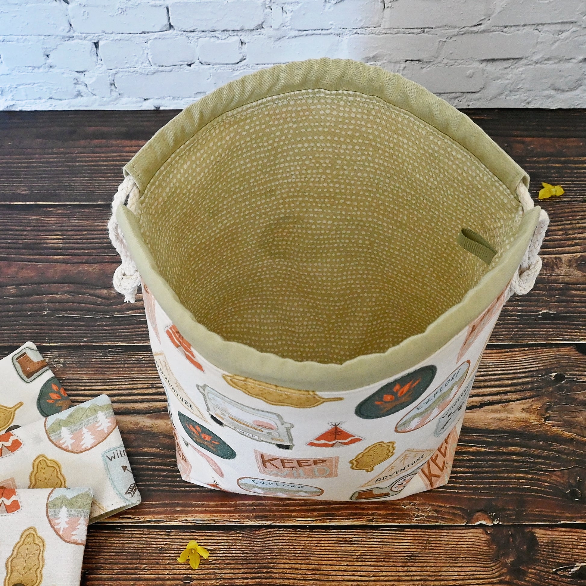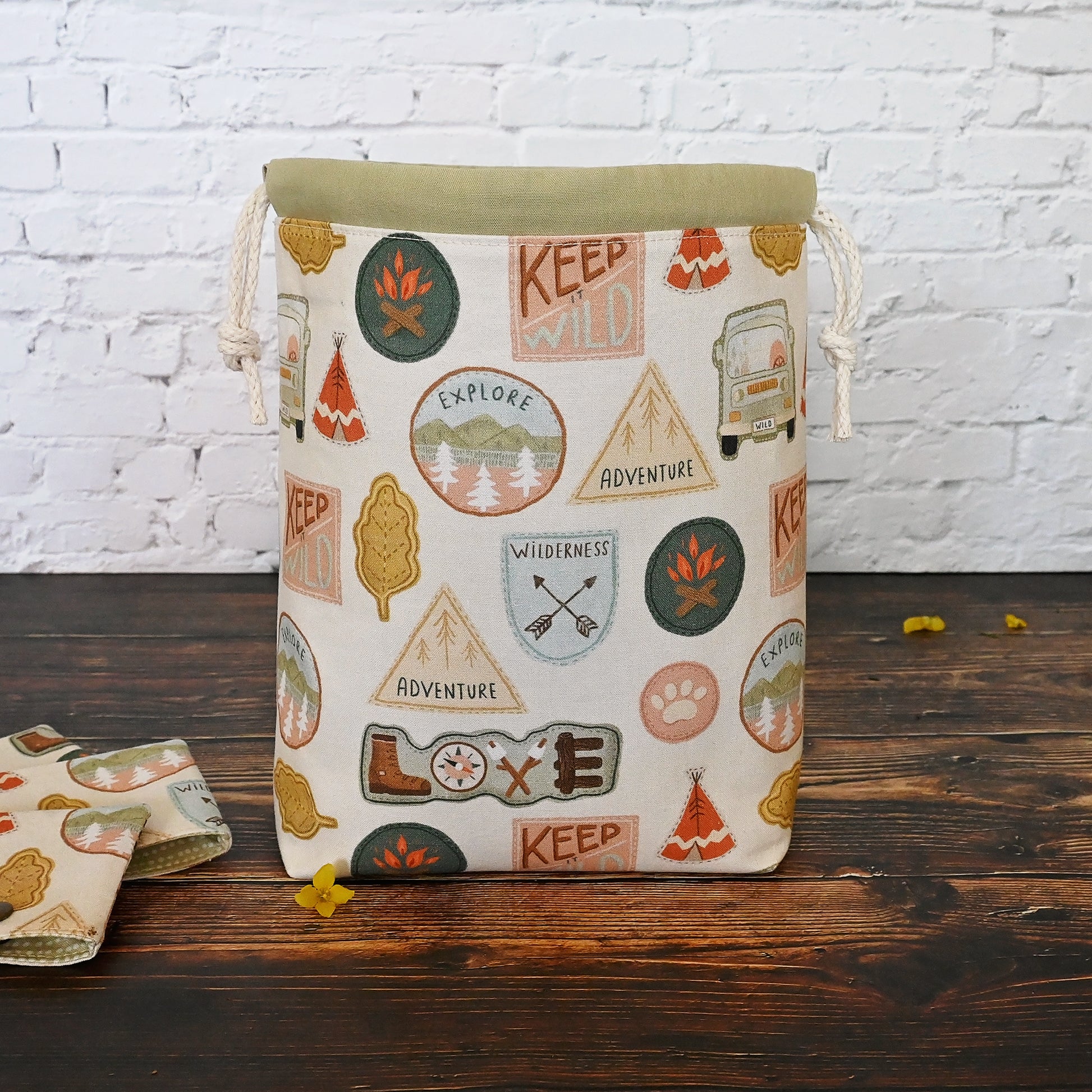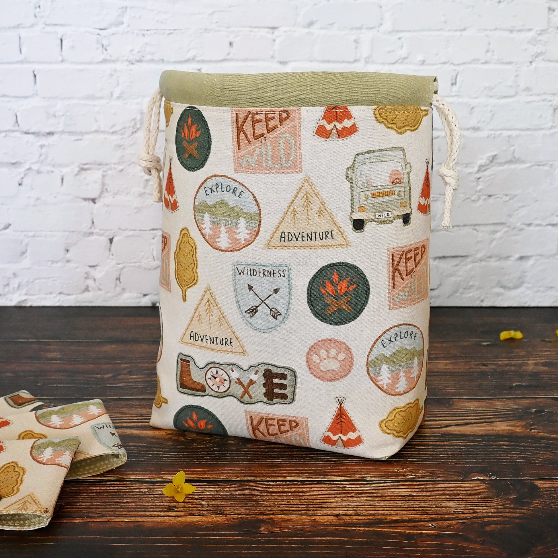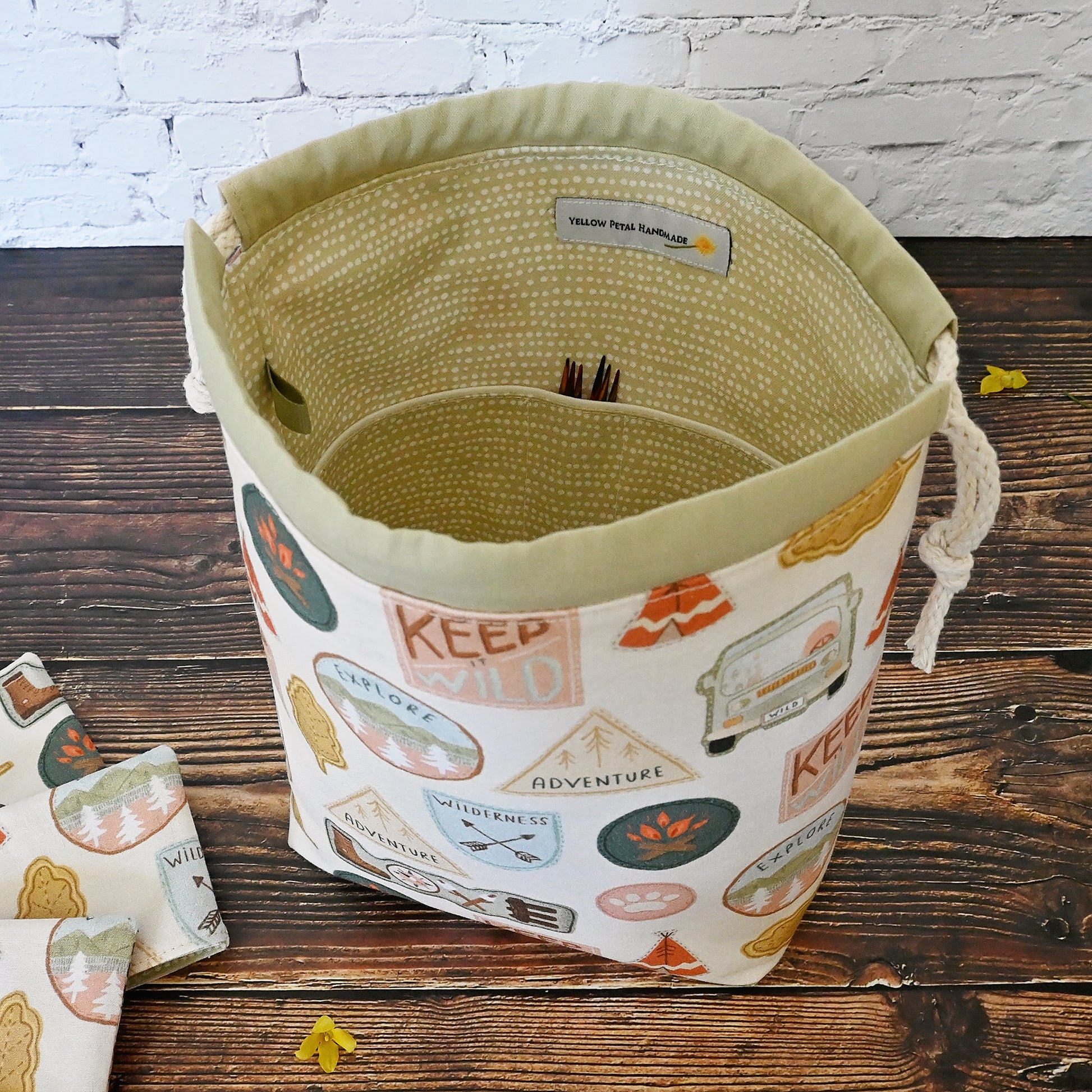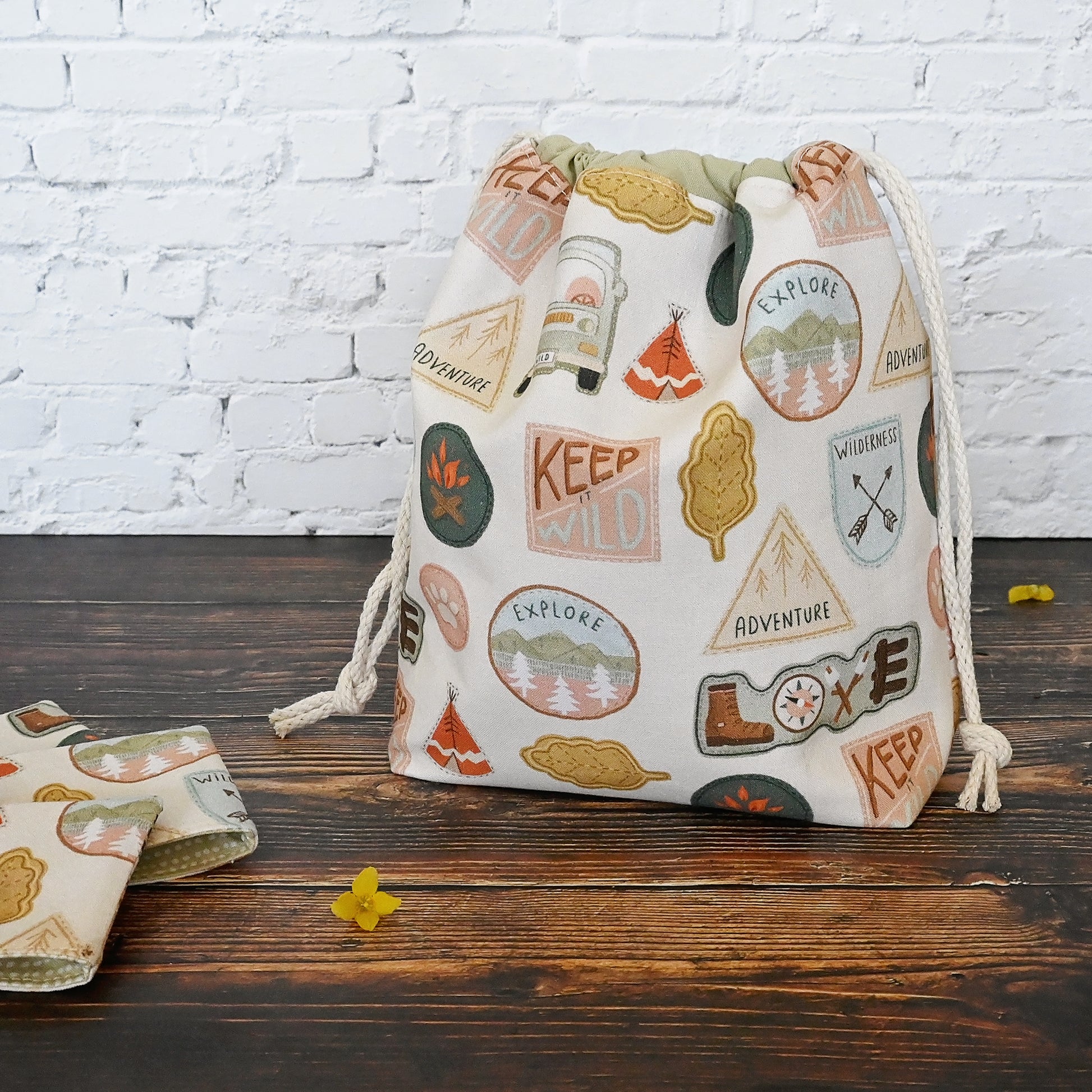 This fun project bag has all sorts of adventure related patches, and is a perfect size for small projects like socks, hats, and cowls.