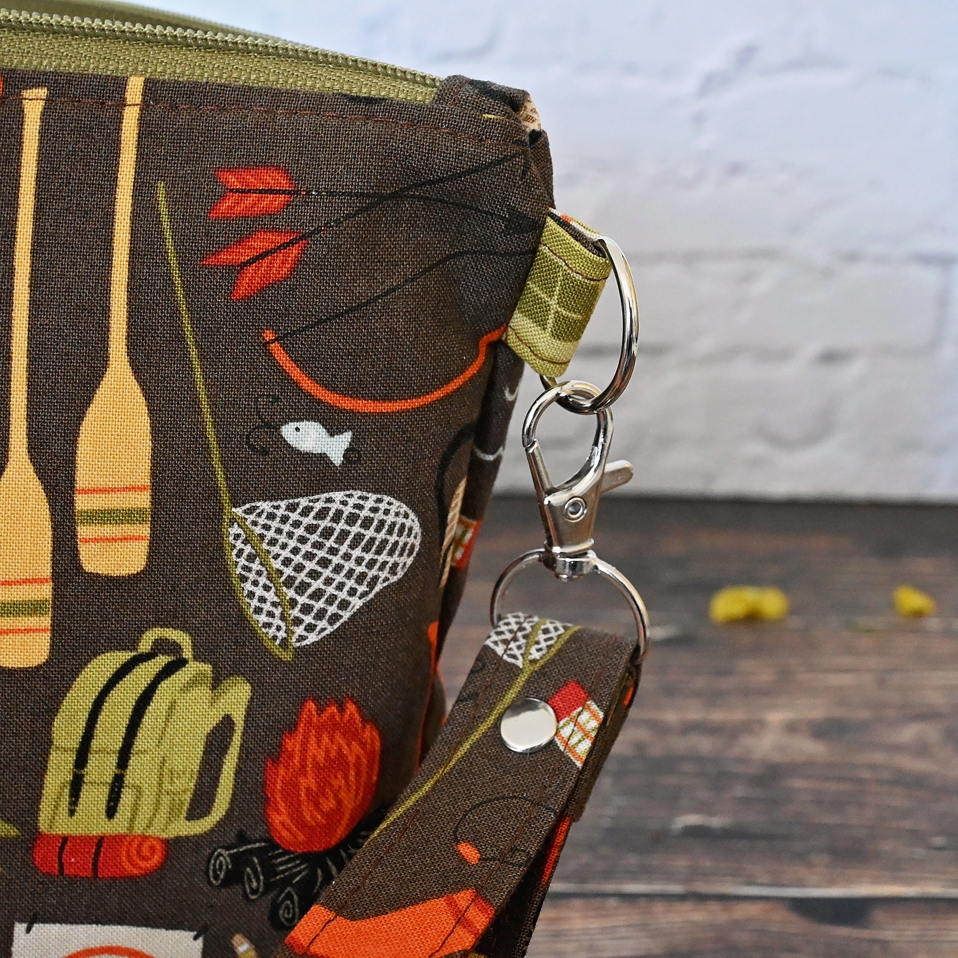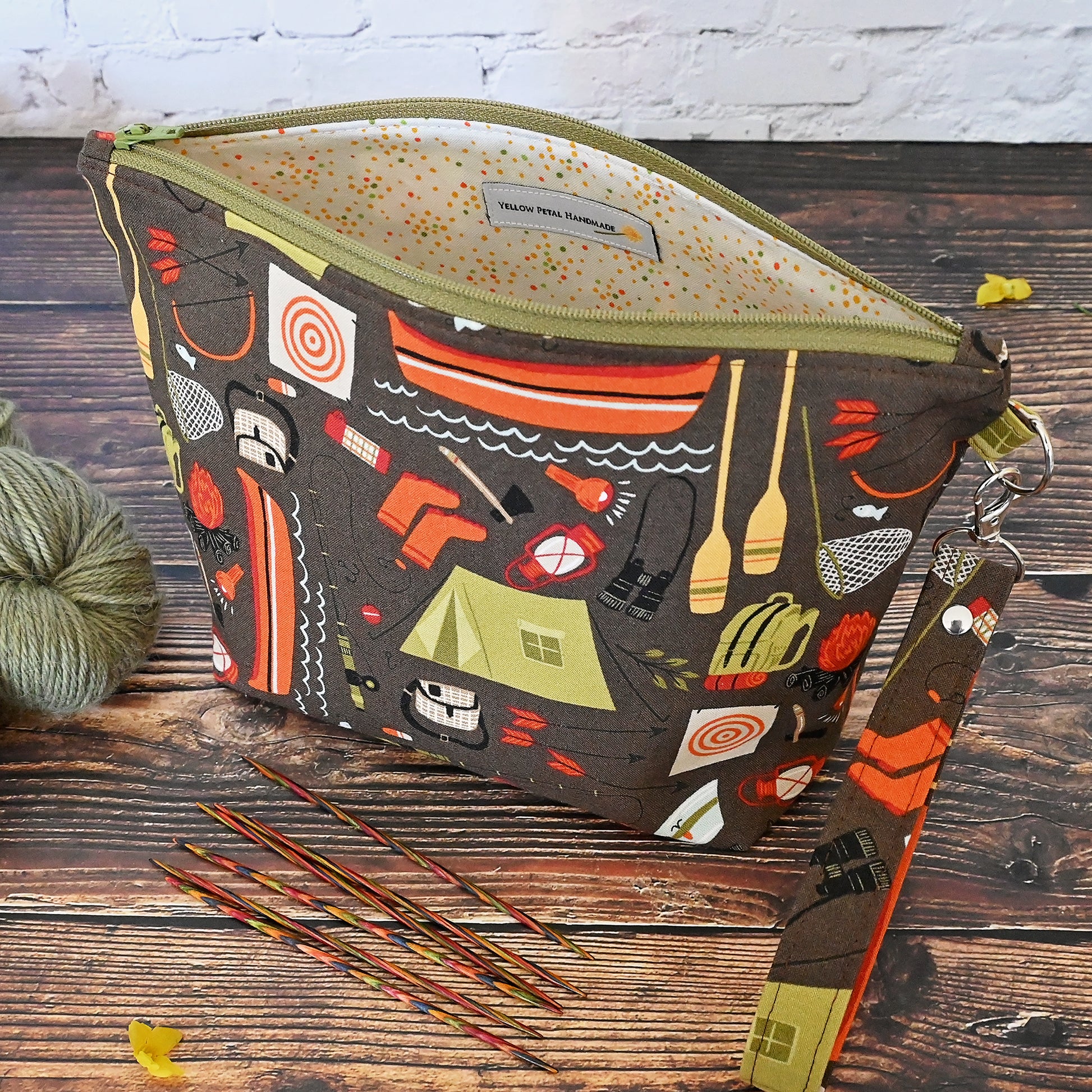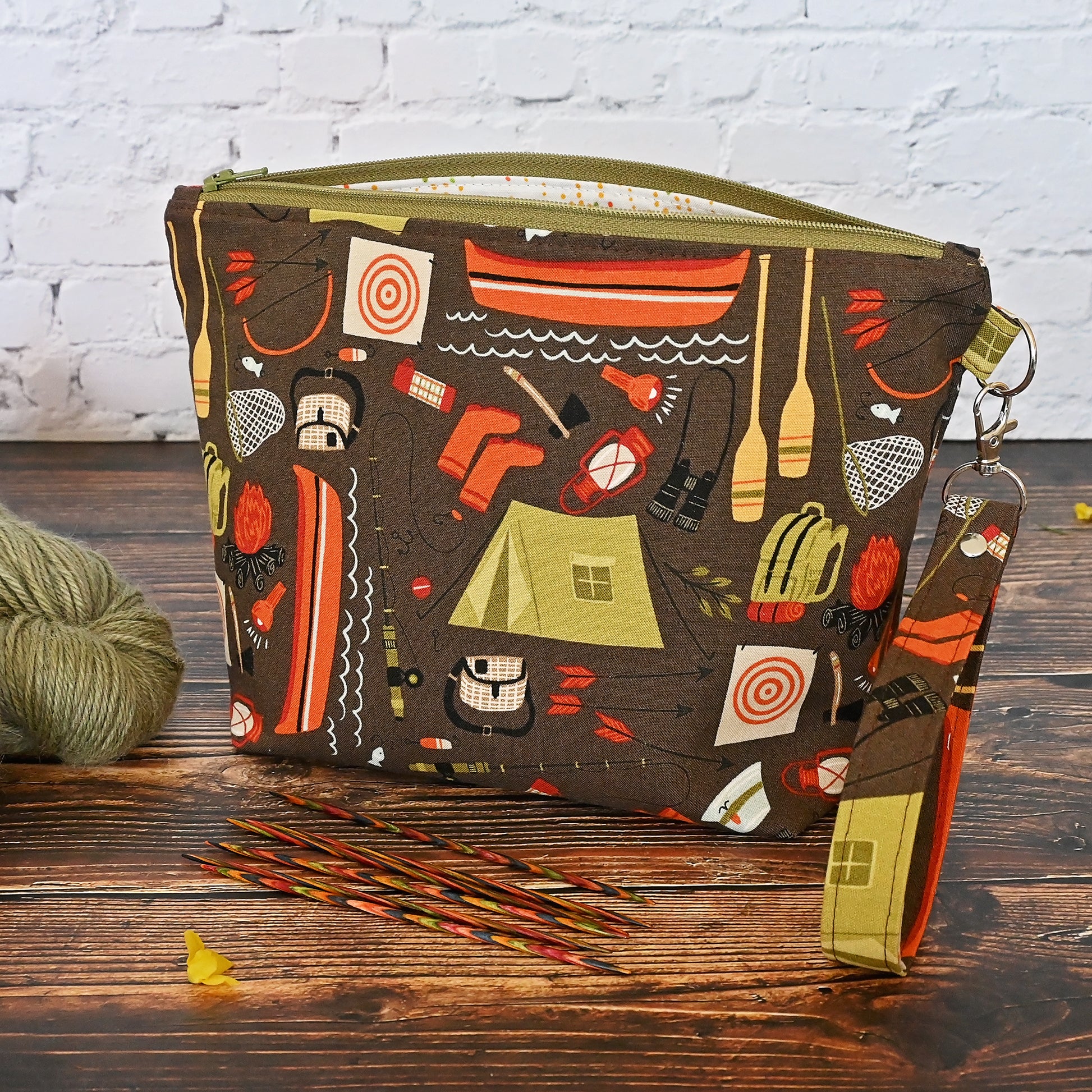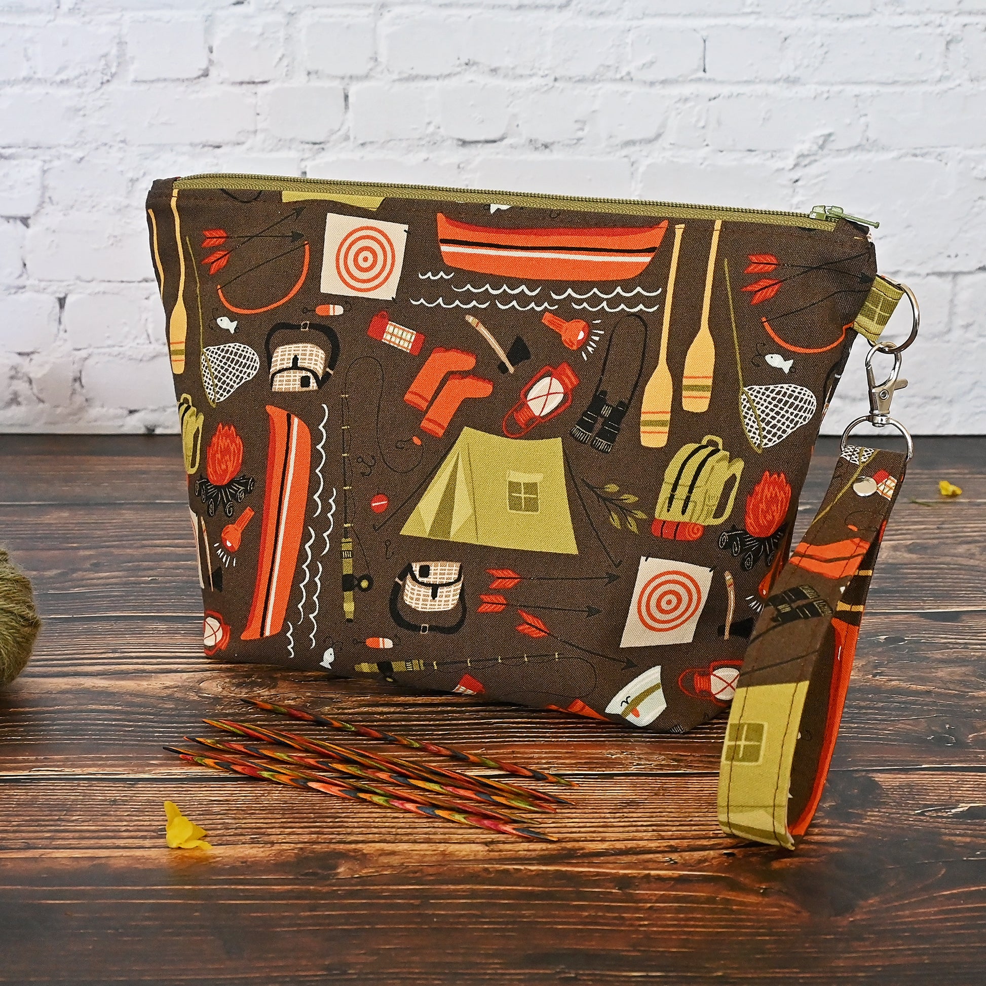 This fun pouch is made from a rich brown fabric and features tents, canoes and all the gear for a waterside adventure! It's a perfect size for small projects like socks or hats. It comes with a detachable strap for easy on-the-go use.