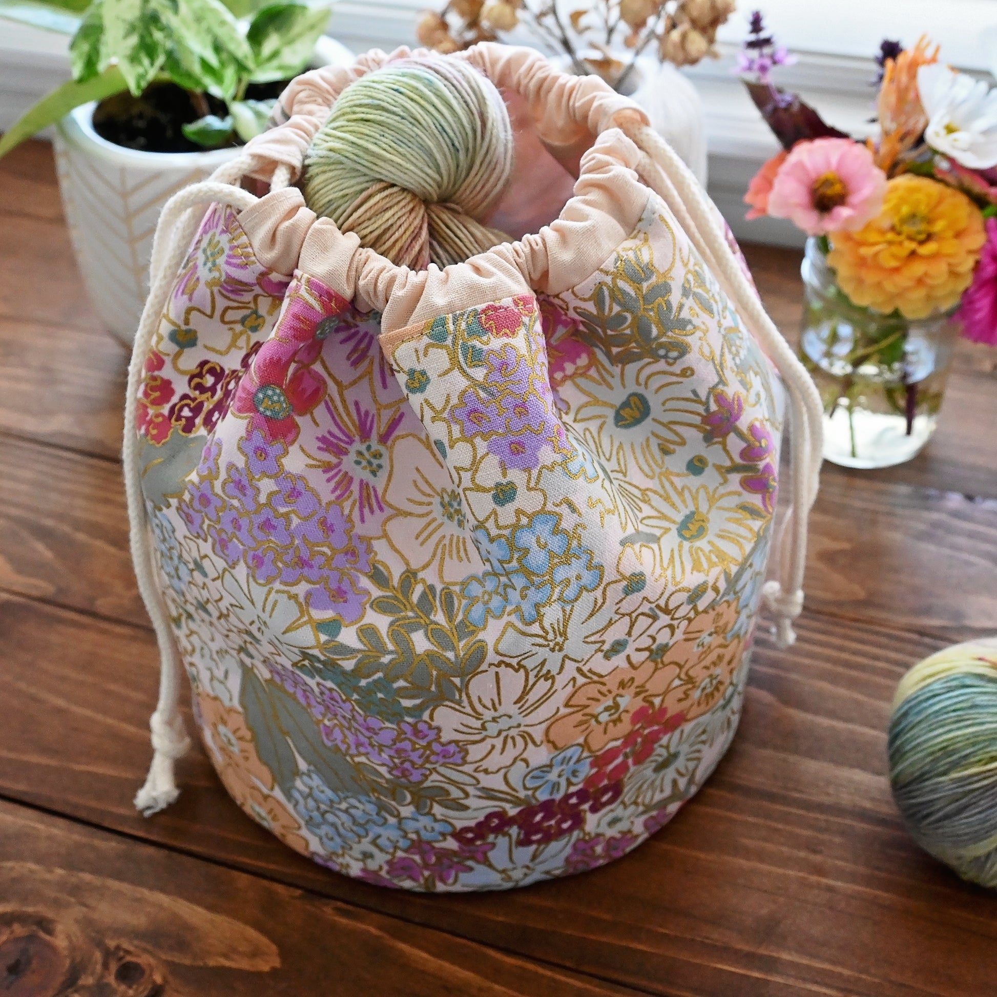 Features This bag is lightly structured to stand on its own.  It measures approximately 8.5" in diameter and 9.5" tall with a quilted base to add detail and support.  It closes easily with a double drawstring.
