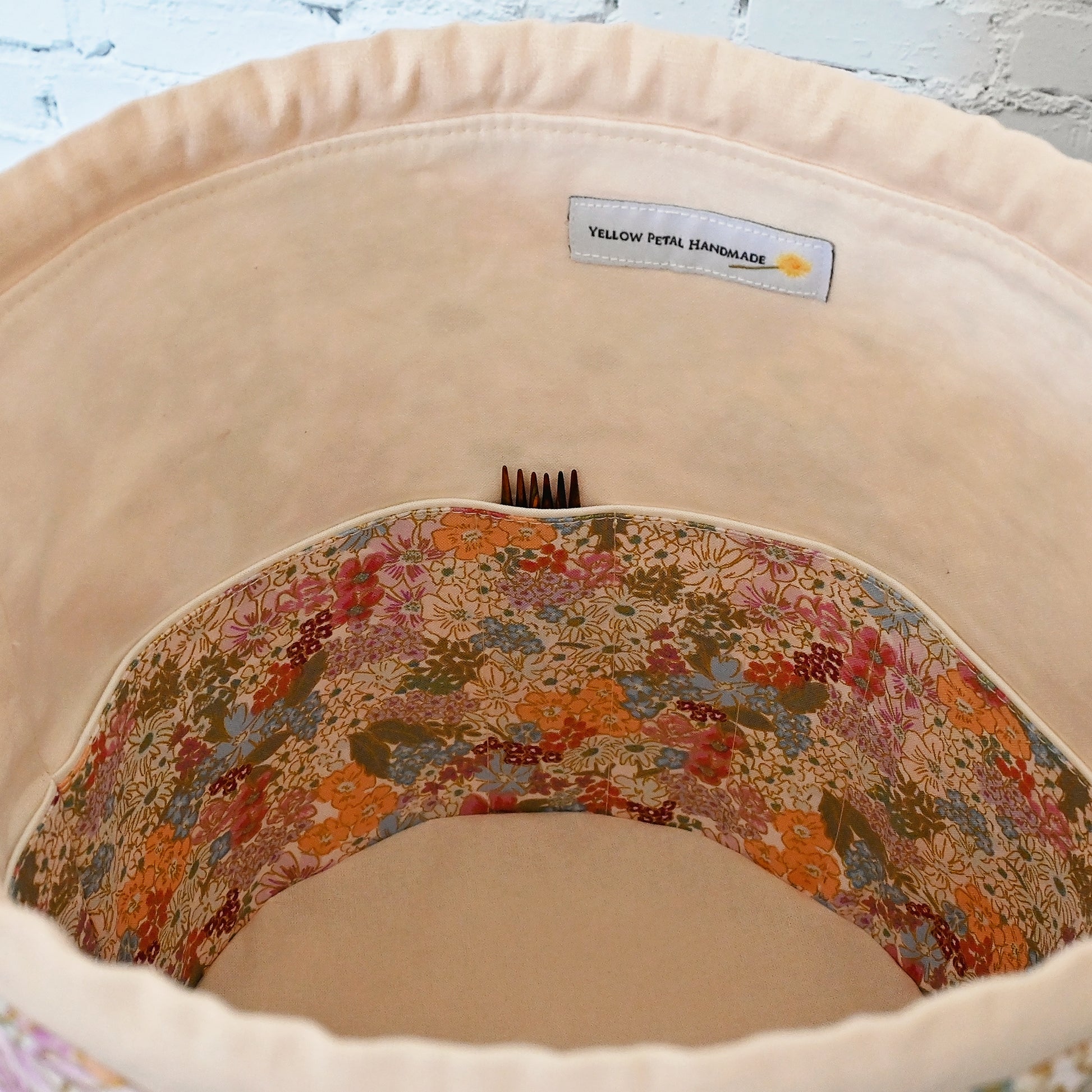 Fabrics:  The exterior of this bag features a gorgeous metallic floral canvas from the English Rose collection by Rifle Paper Co.  The interior lining is a pink organic cotton with English Rose pockets, also in cotton.