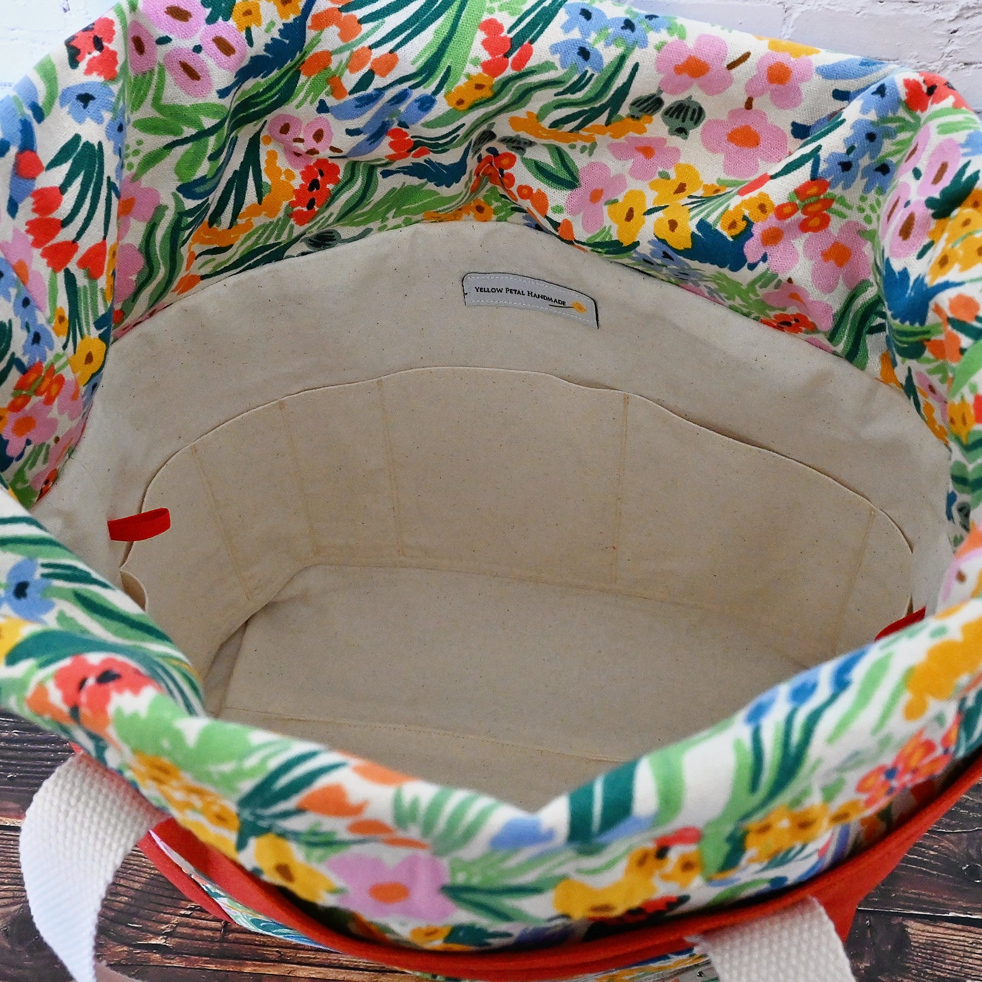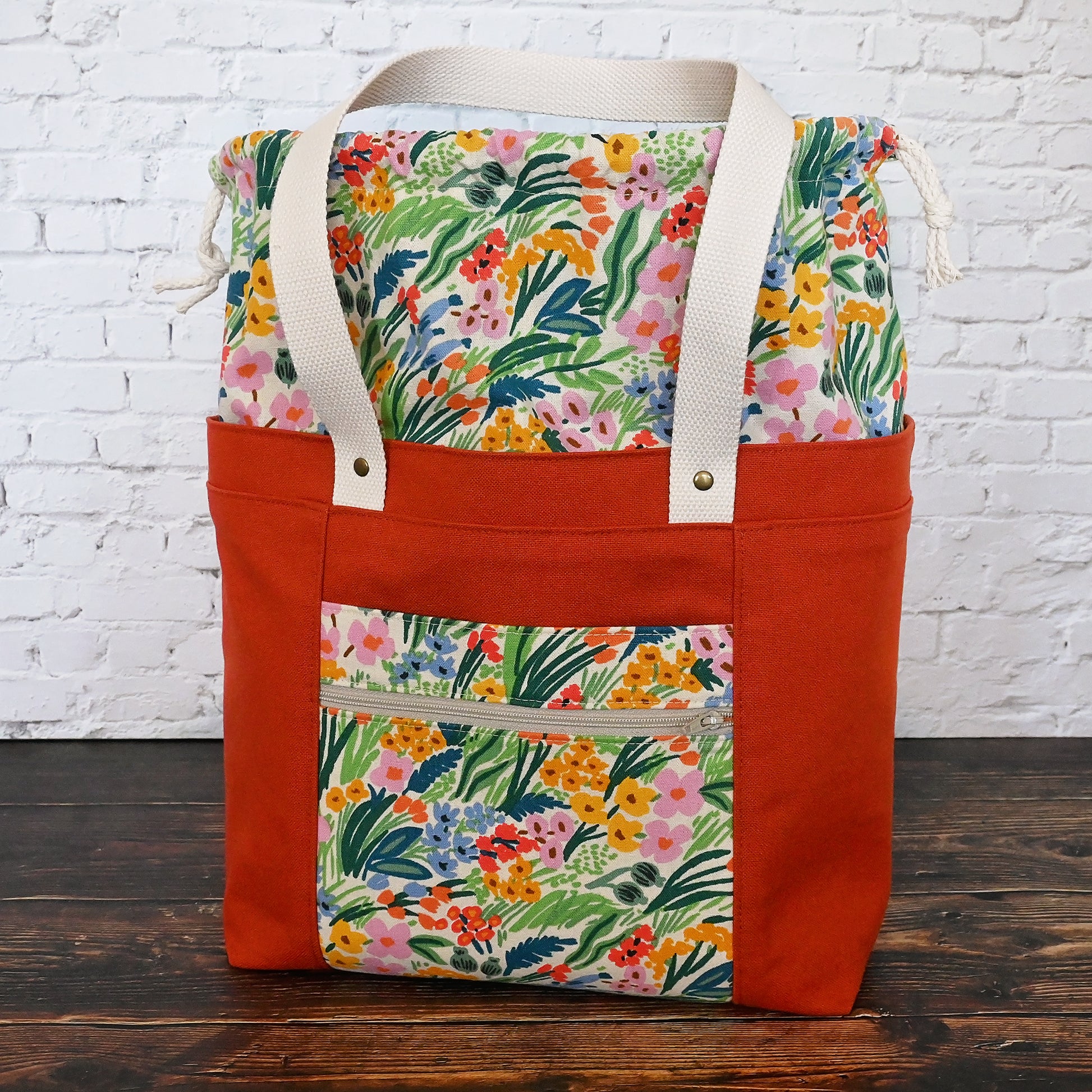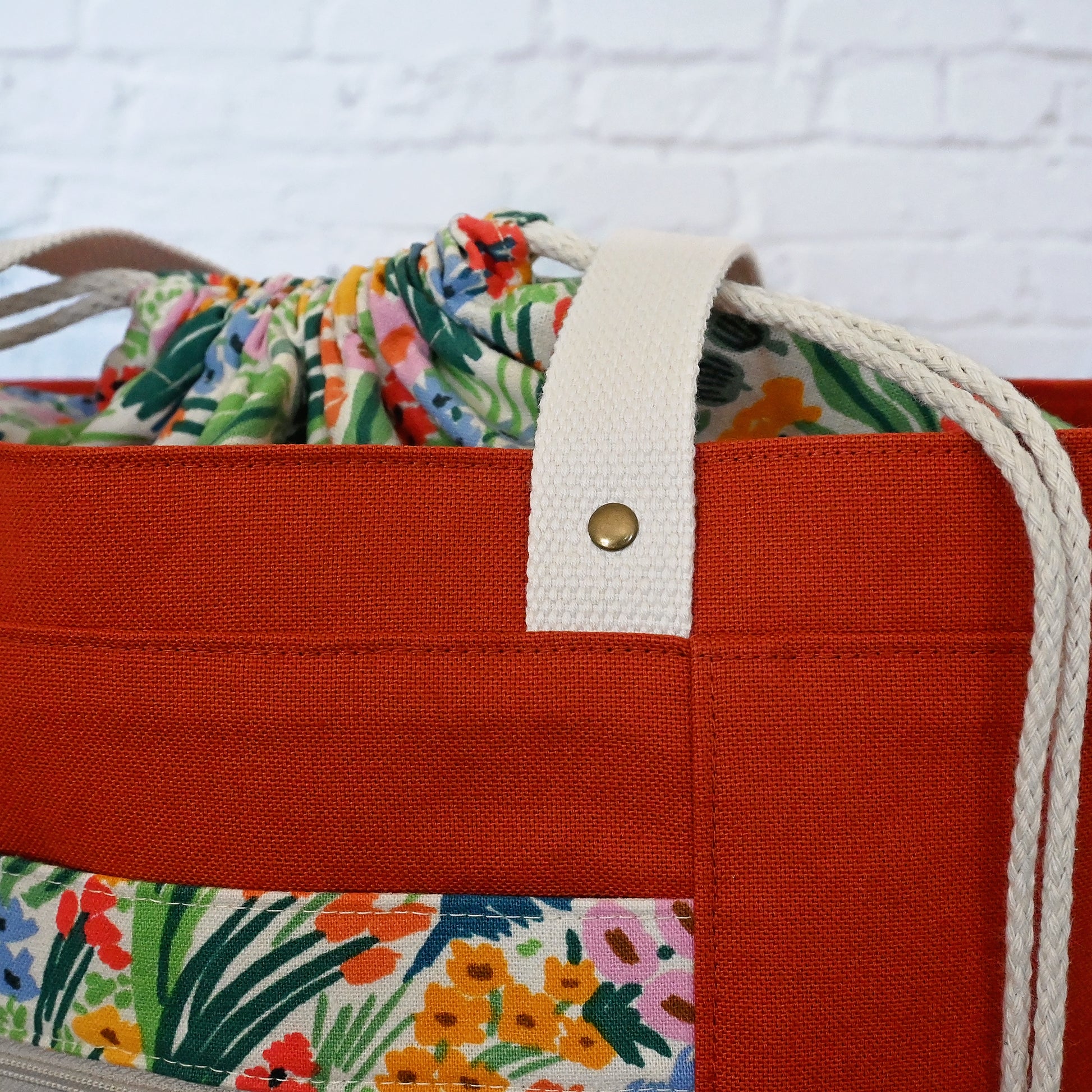 The Field of Flowers Project Tote is thoughtfully designed for makers who love beauty and function in equal measure. The exterior is made from a sturdy terracotta cotton canvas and paired with a striking premium canvas from Rifle Paper Co's Bramble Collection. Β