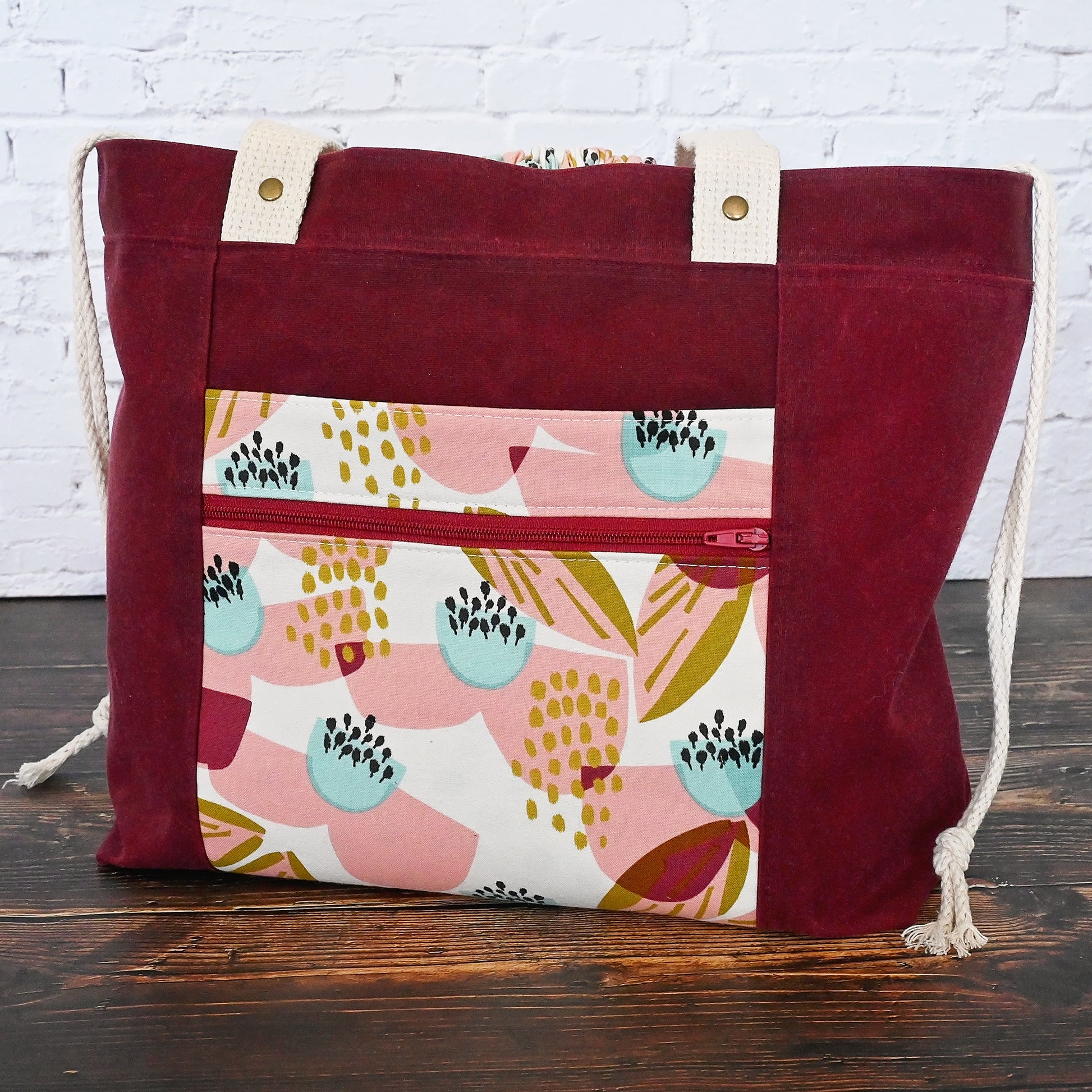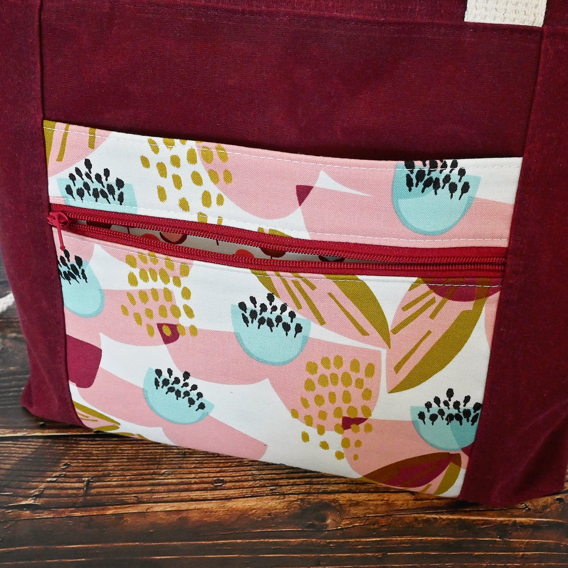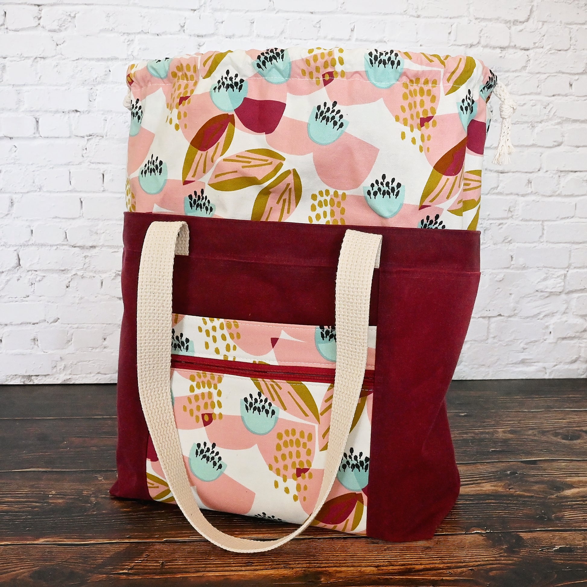 This Rosewood Tote is made from a beautiful mix of a rich and water resistant waxed canvas, paired with vibrant floral cottons. Β It's got multiple pockets, designed with knitters in mind. Β It's a great size for large projects like sweaters!