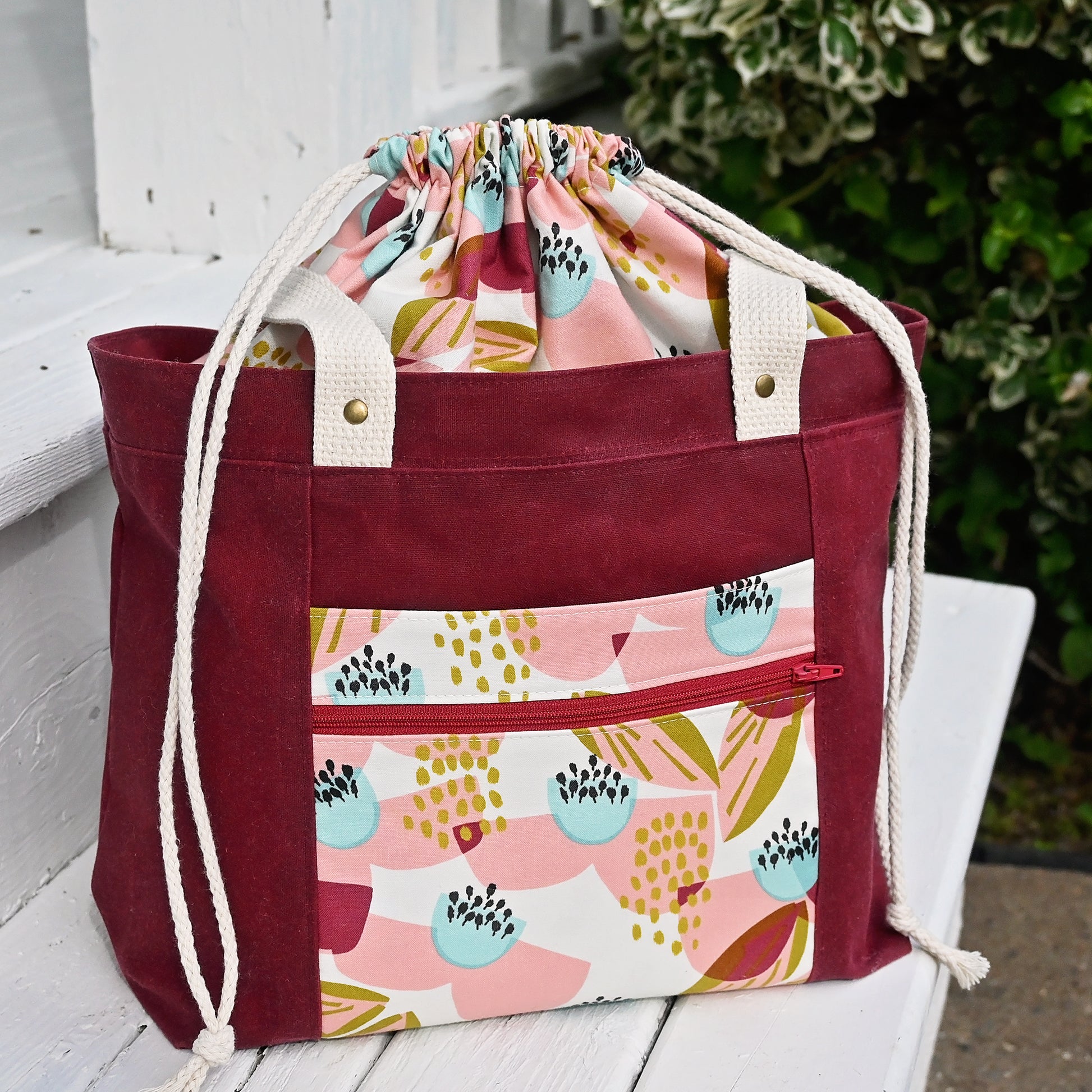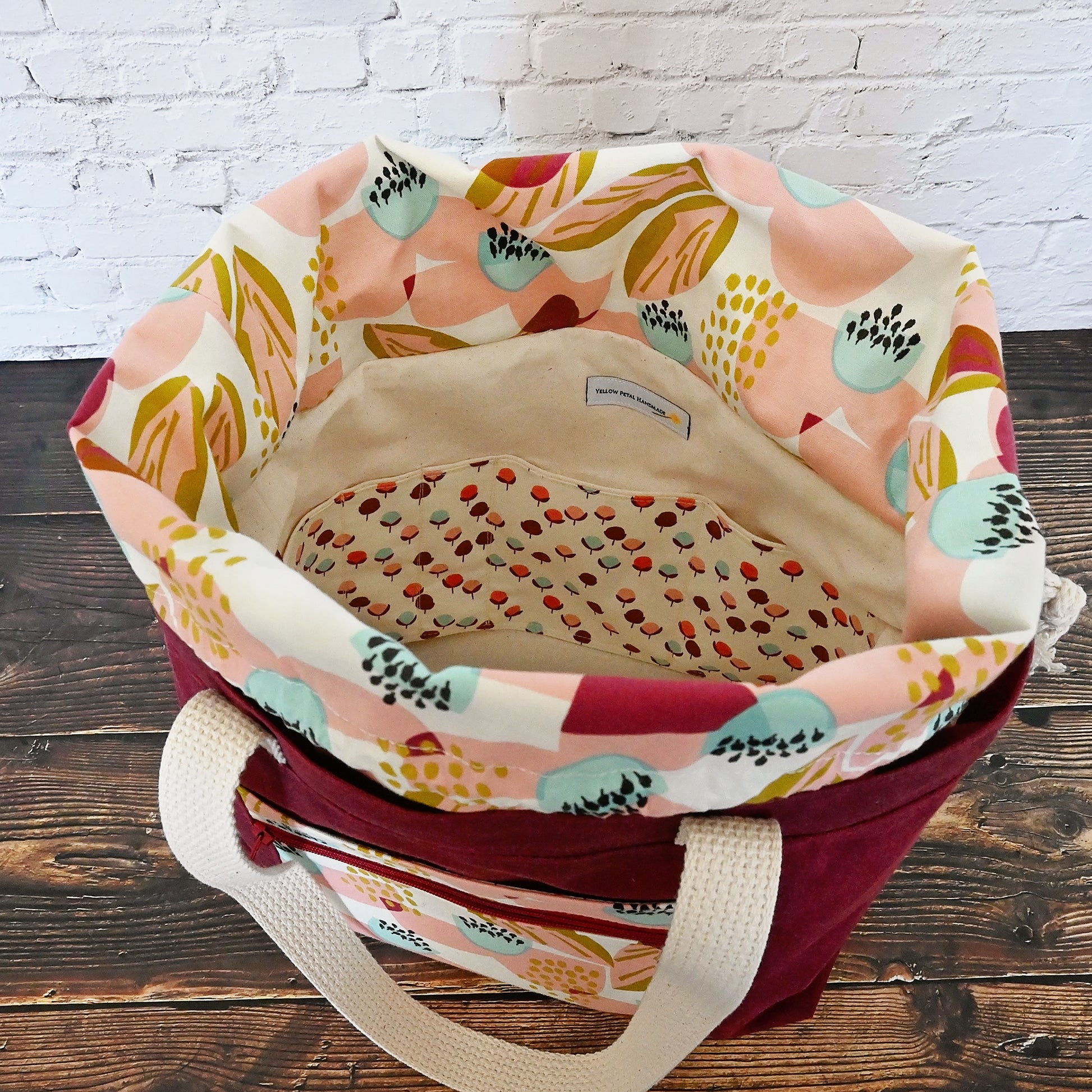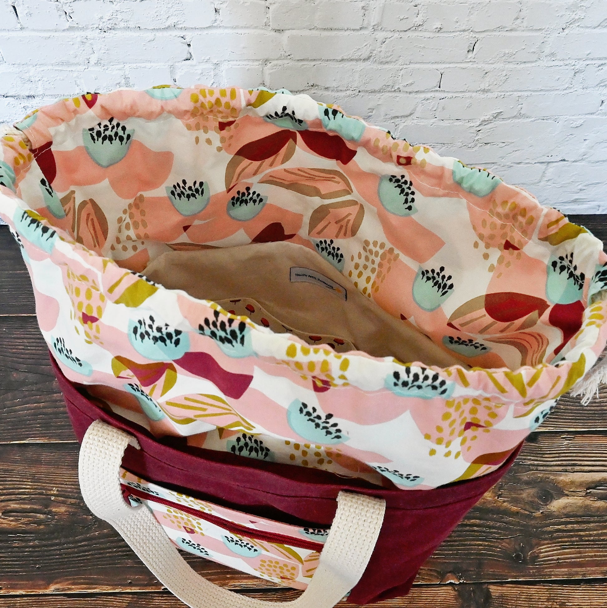 This Rosewood Tote is made from a beautiful mix of a rich and water resistant waxed canvas, paired with vibrant floral cottons. Β It's got multiple pockets, designed with knitters in mind. Β It's a great size for large projects like sweaters!