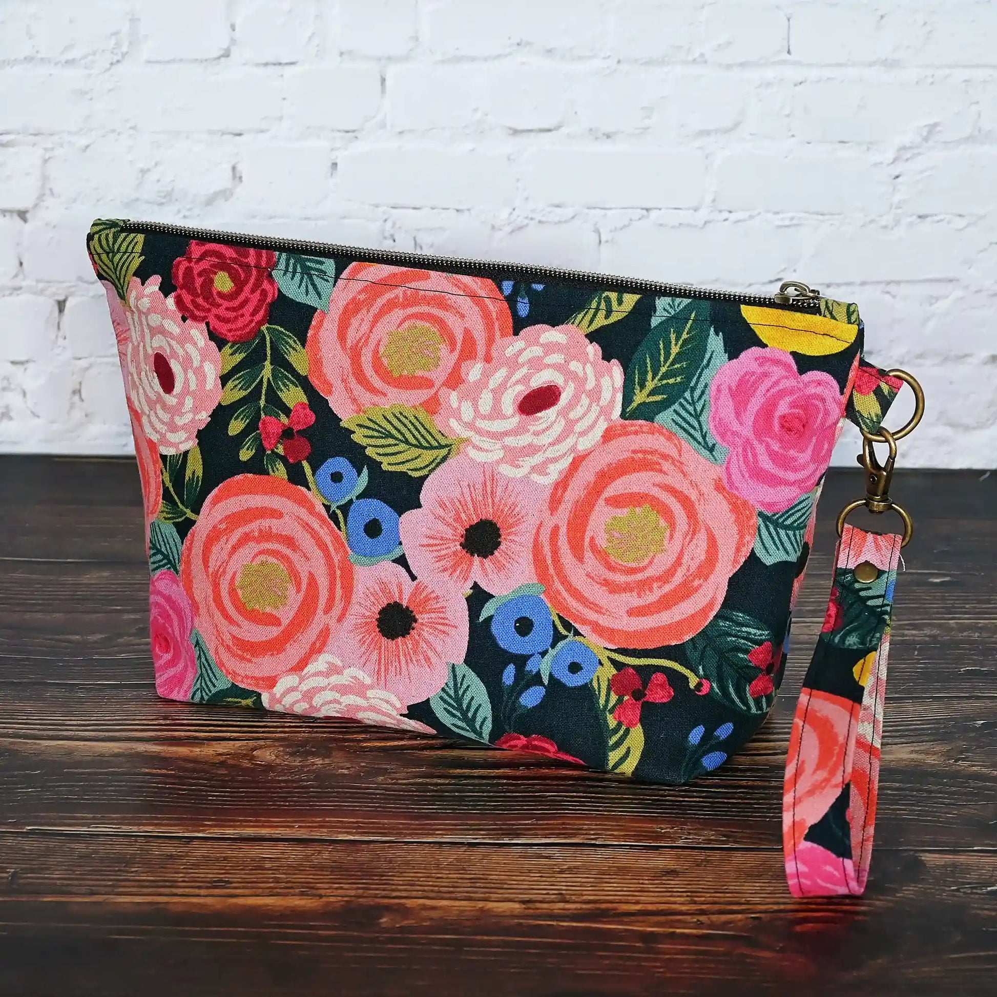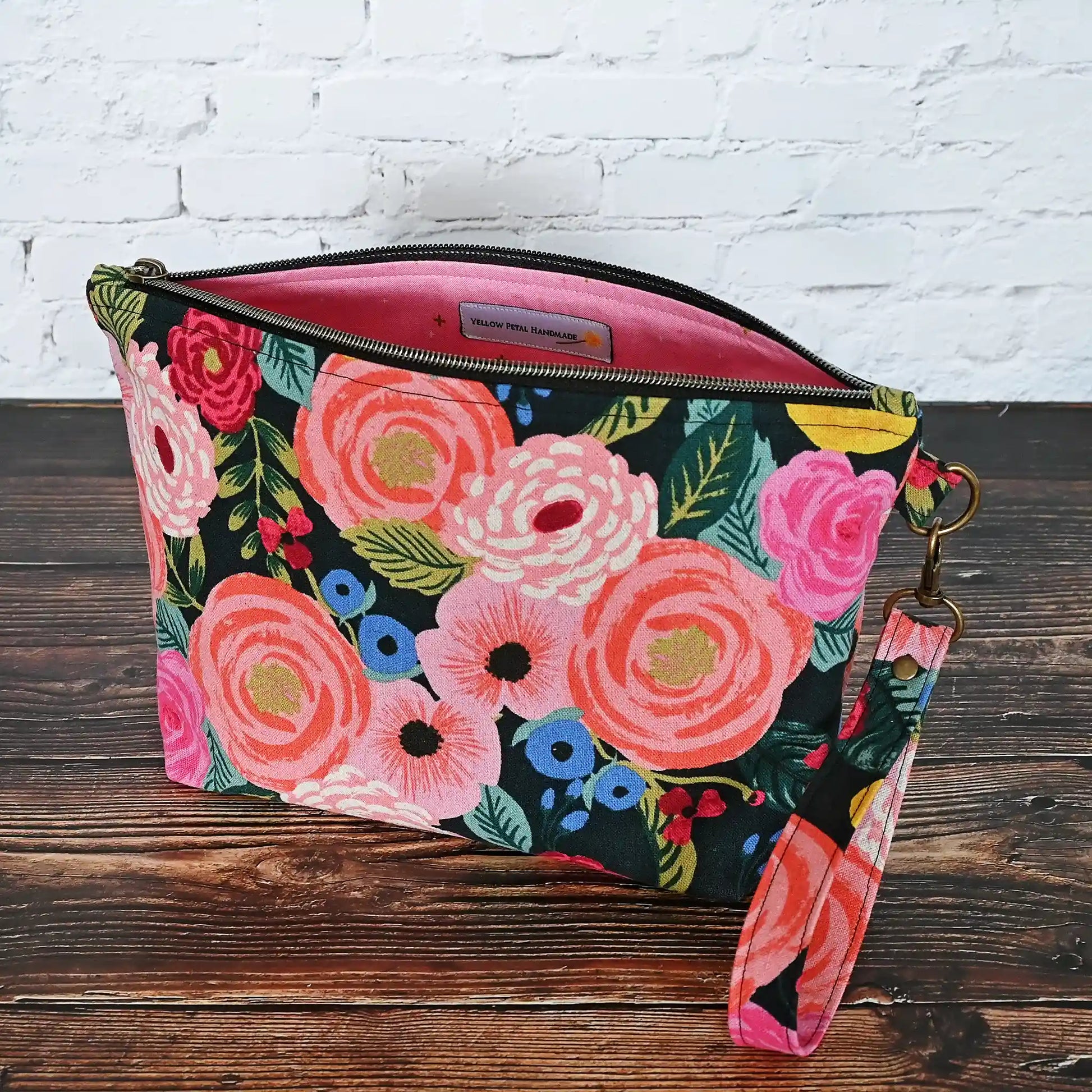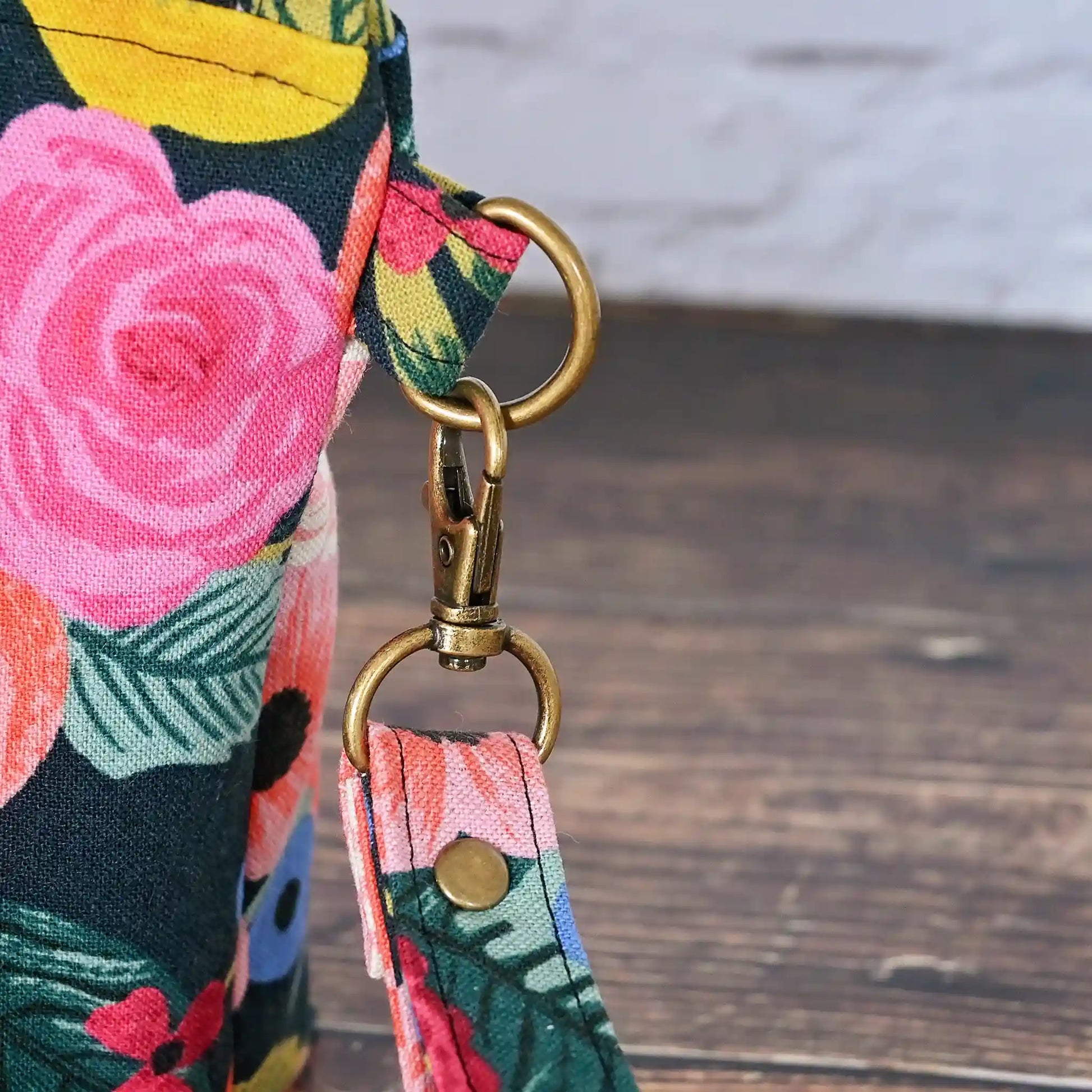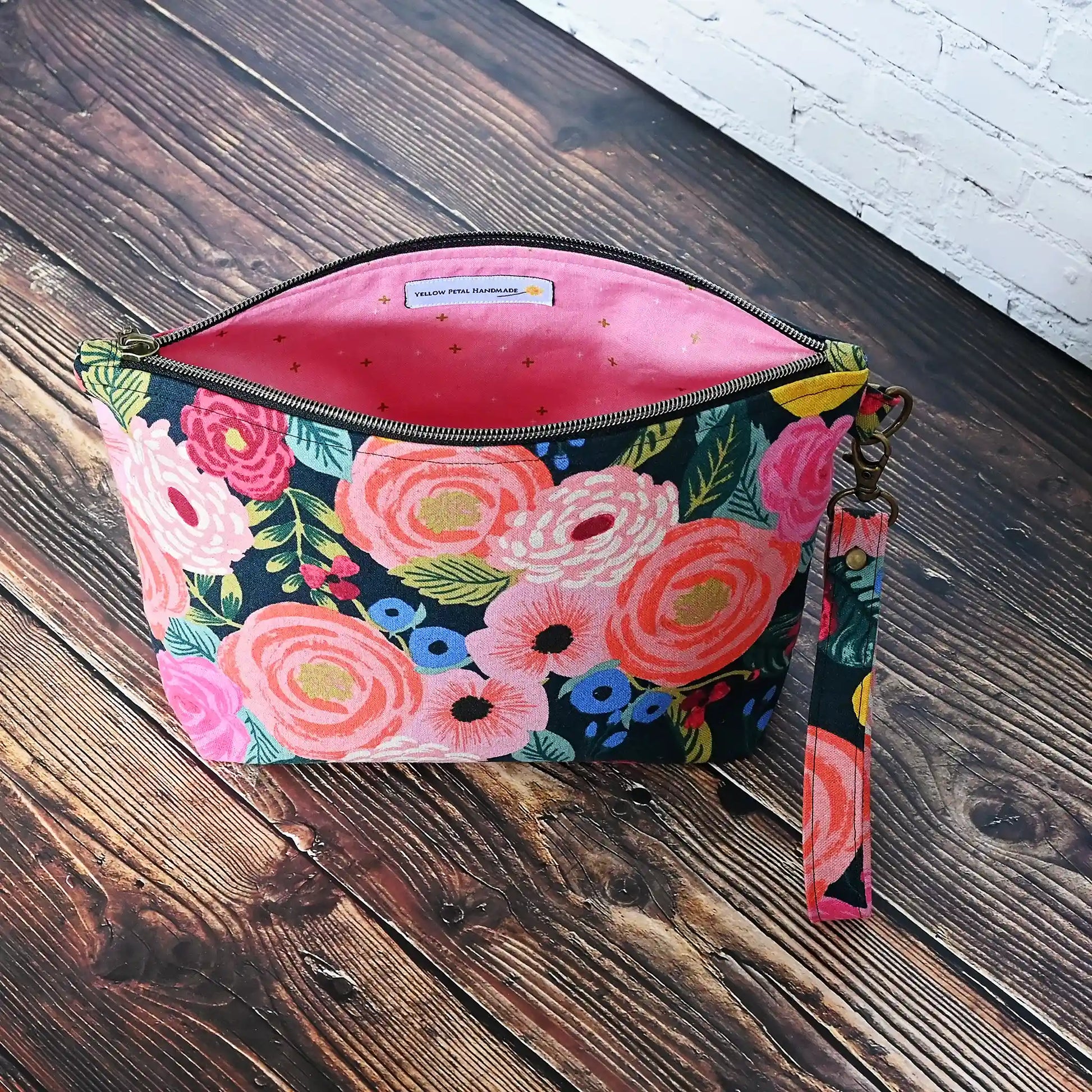 This bag is made from Rifle Paper Co's English Garden canvas and is lined with a pretty pink cotton with gold accents from Riley Blake.