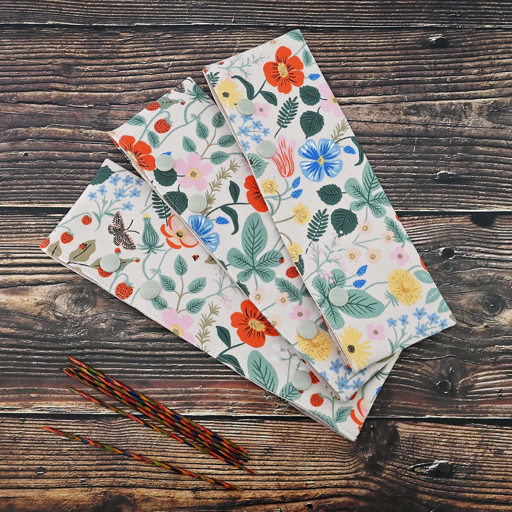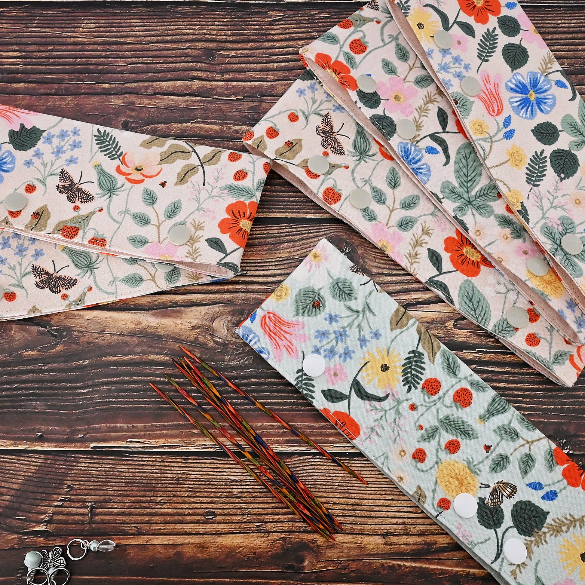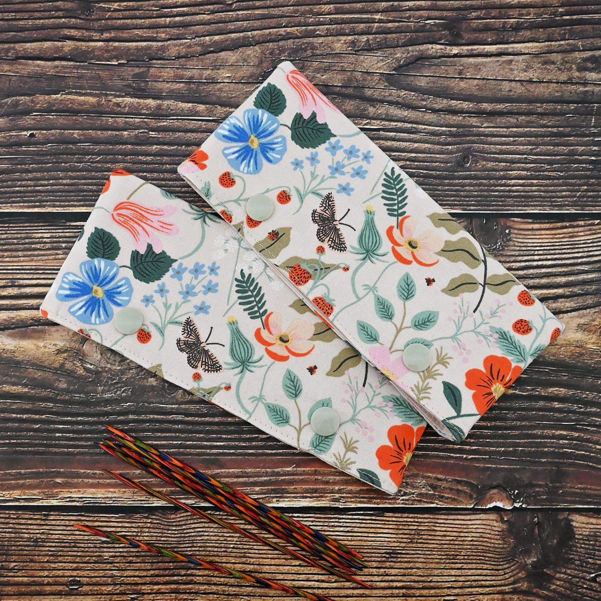 These cozies are perfect little WIP holders for DPNs or circular needles.  They secure your work and keep it from slipping off your needles.  These work well for small projects on DPNs, keeping everything in place while you're transporting your project.  They're also are great for keeping your larger projects on circular needles safe and secure - just pop your needles in the cozy when you've finished knitting and snap it closed to keep everything in place.