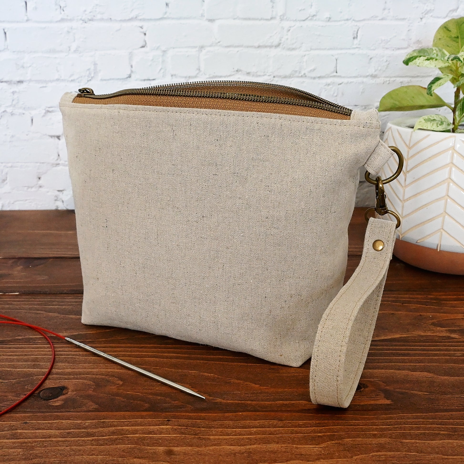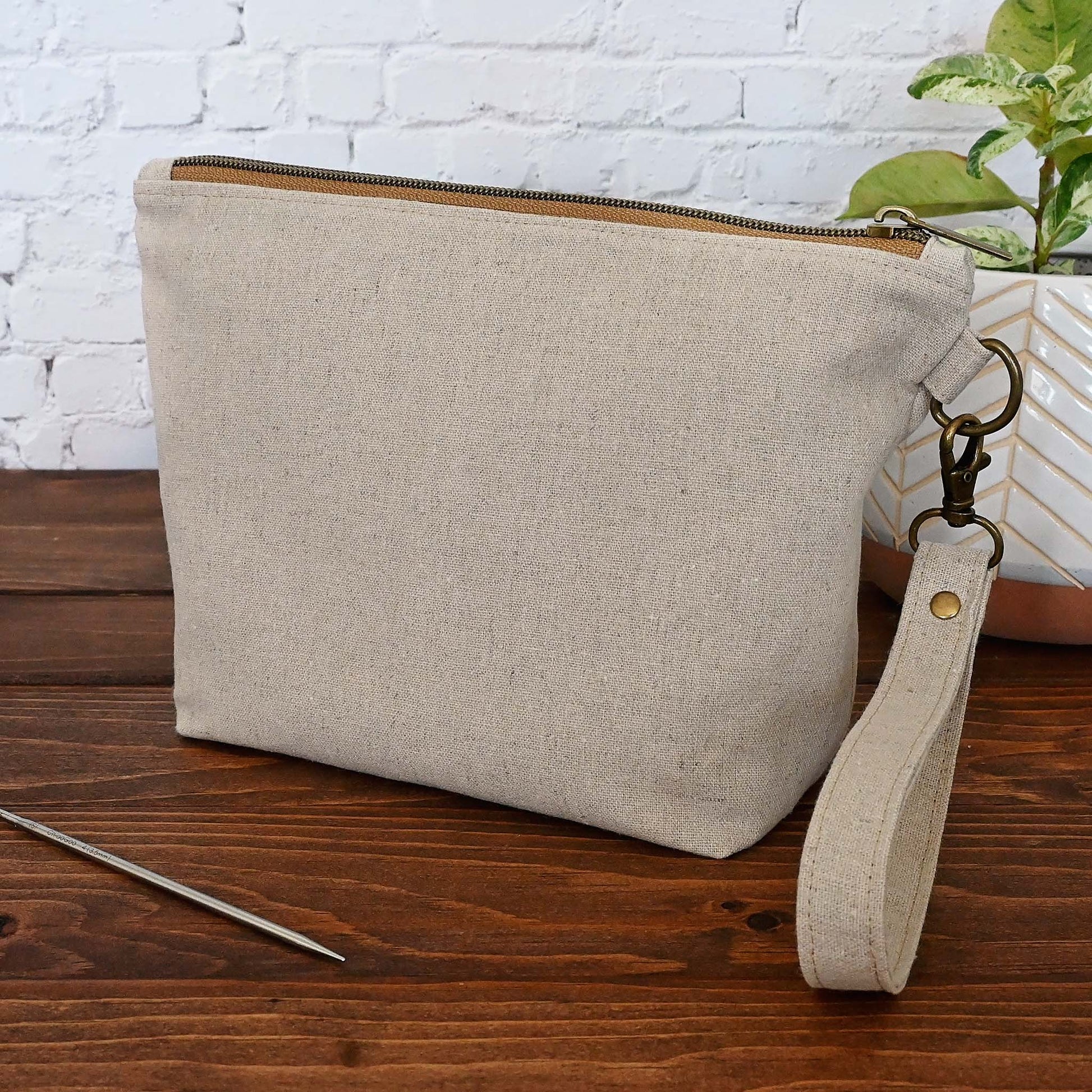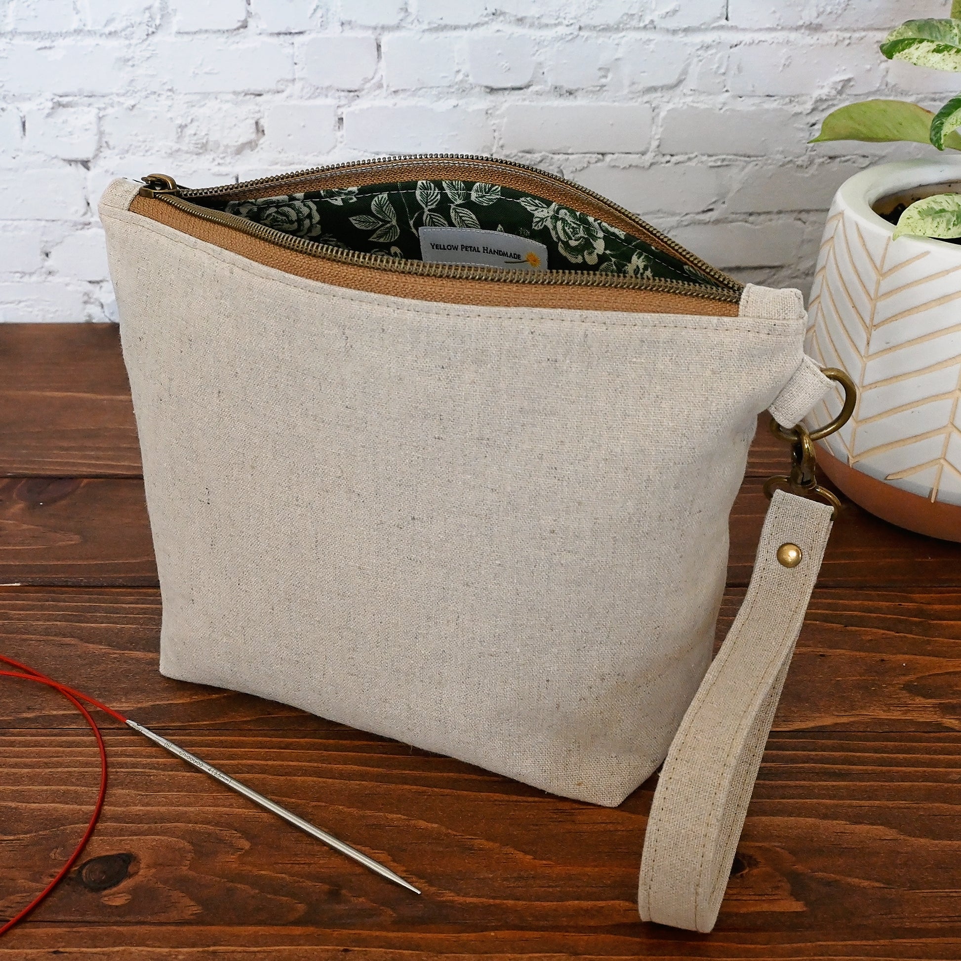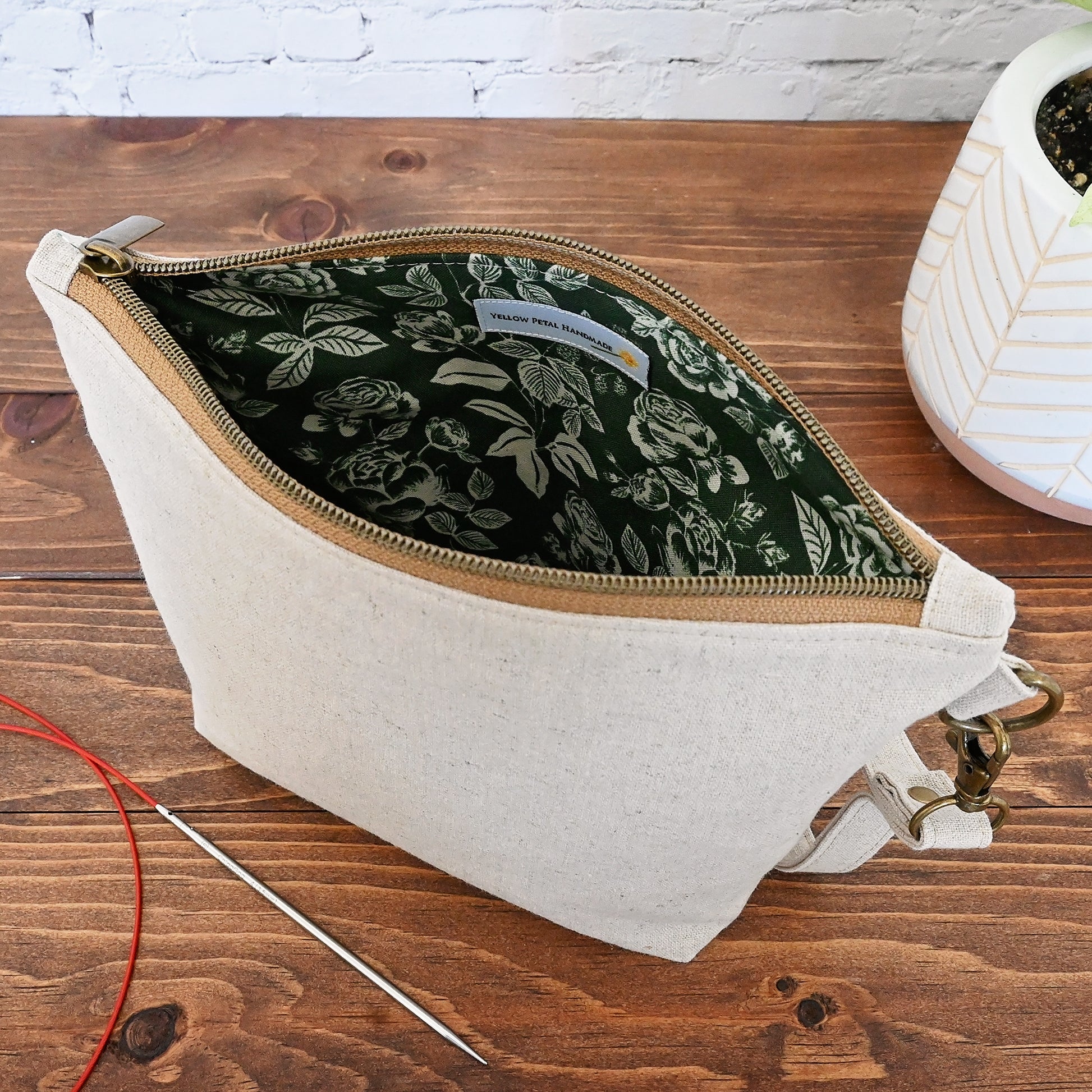 A natural canvas sock pouch with a green and natural floral lining.  Perfect if you love a subtle, classic bag with an eye catching interior.  This pouch is lightly reinforced, and it comes with a detachable strap for easy on-the-go use.