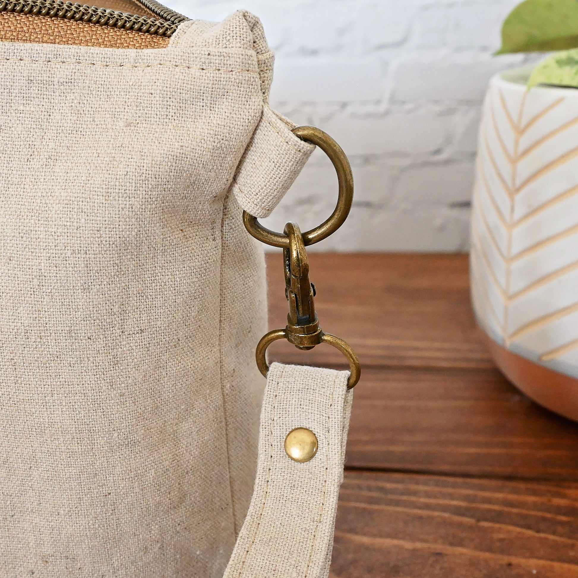 The exterior is a natural canvas by Robert Kaufman and the interior is a pretty green and natural floral from the English Garden Collection by Rifle Paper Co.