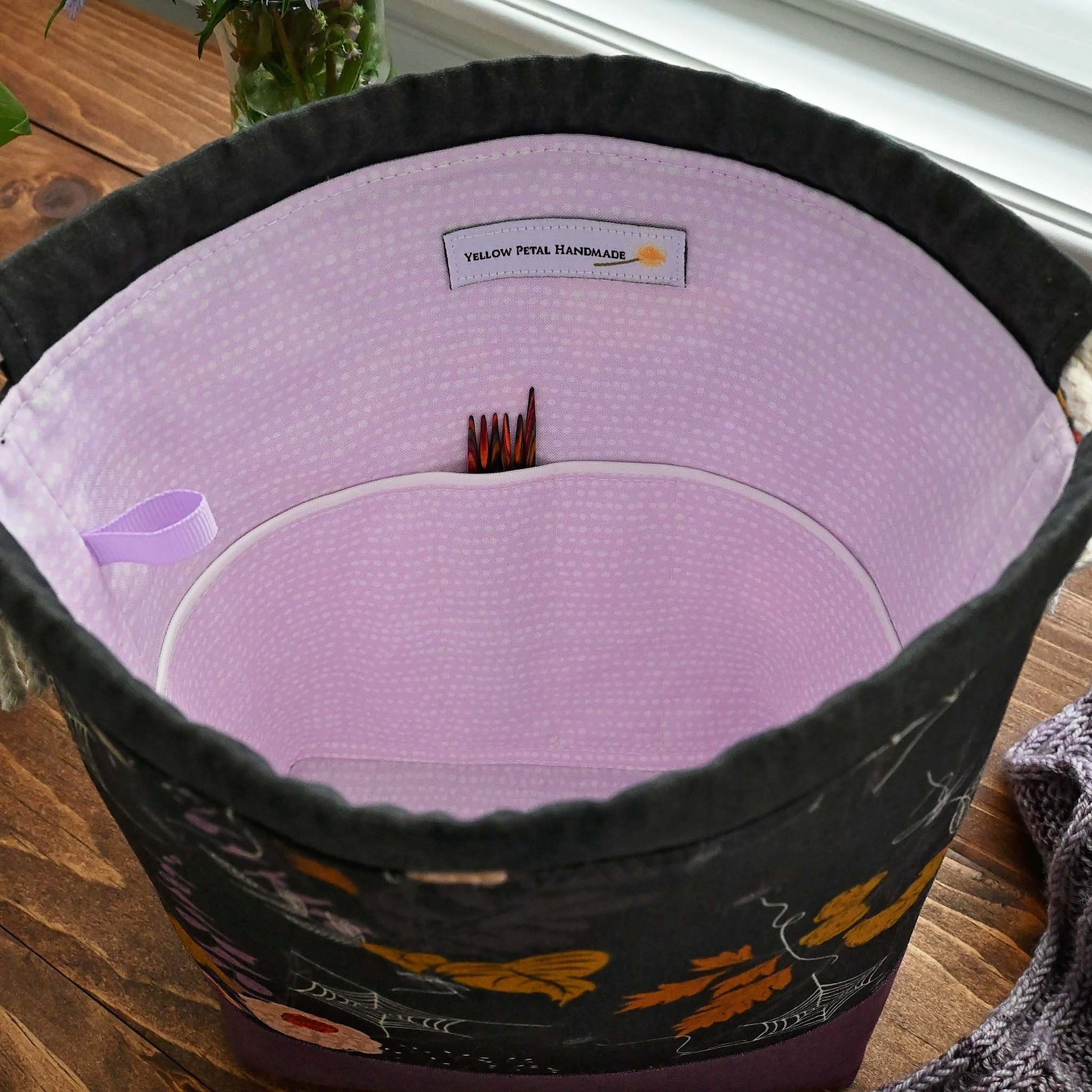 This fun and spooky drawstring project bag is a perfect size for socks or other small projects and is lightly structured to stand alone. It's made from a Art Gallery Fabric's Cast a Spell collection paired with an eggplant linen. It's lined in a pretty lilac and white cotton from Dear Stella.