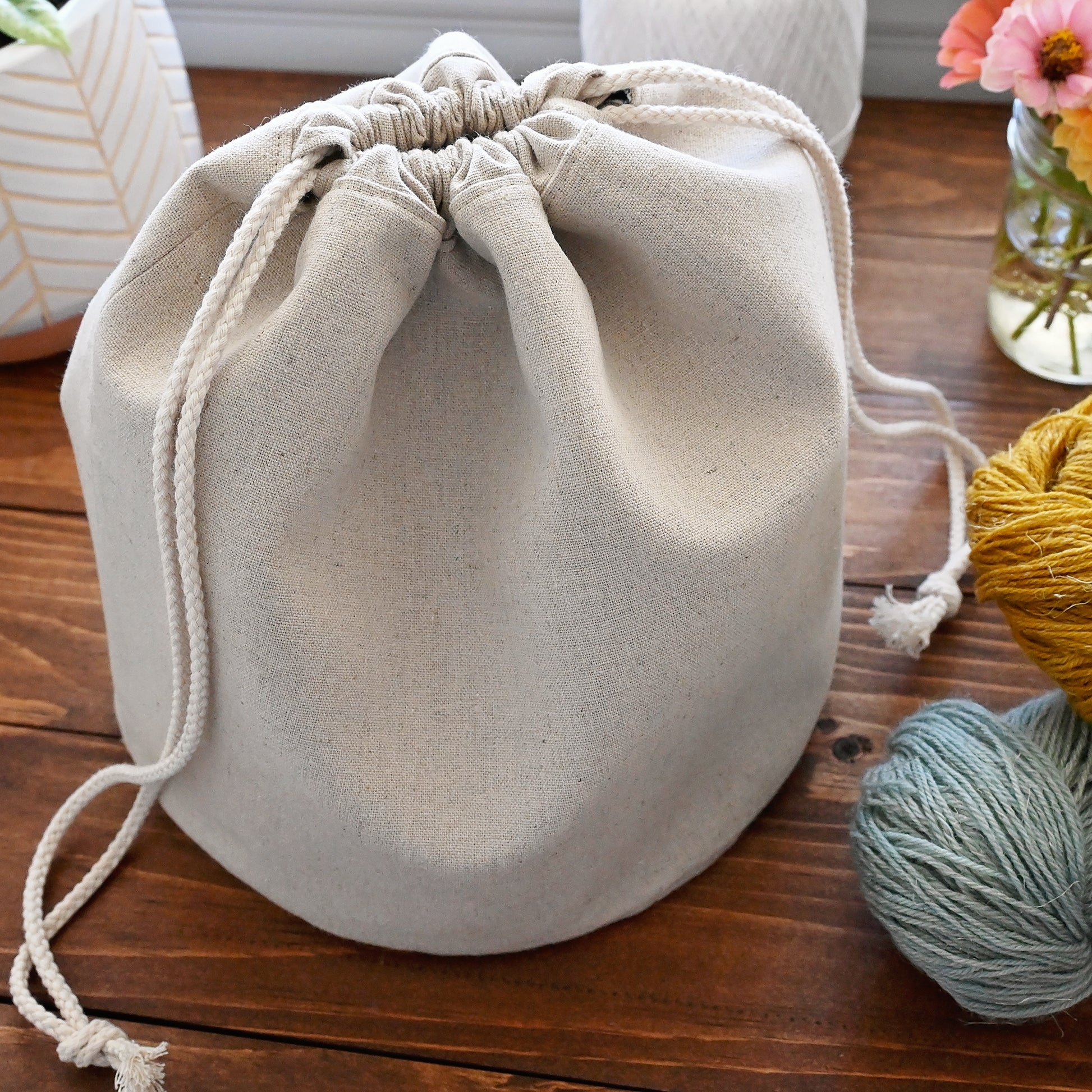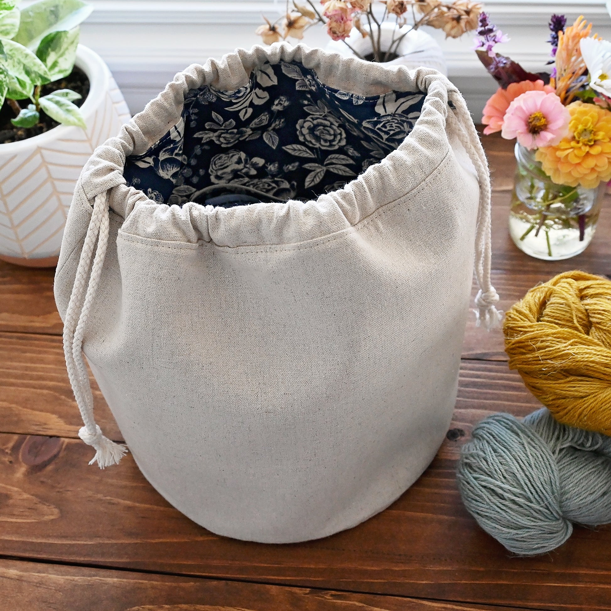 This bag is round and can accommodate medium to larger lightweight projects. The base is quilted both as a fun detail and to provide cushioning and support to the bottom of the bag, and it folds down beautifully for easy access while you're working on your project.