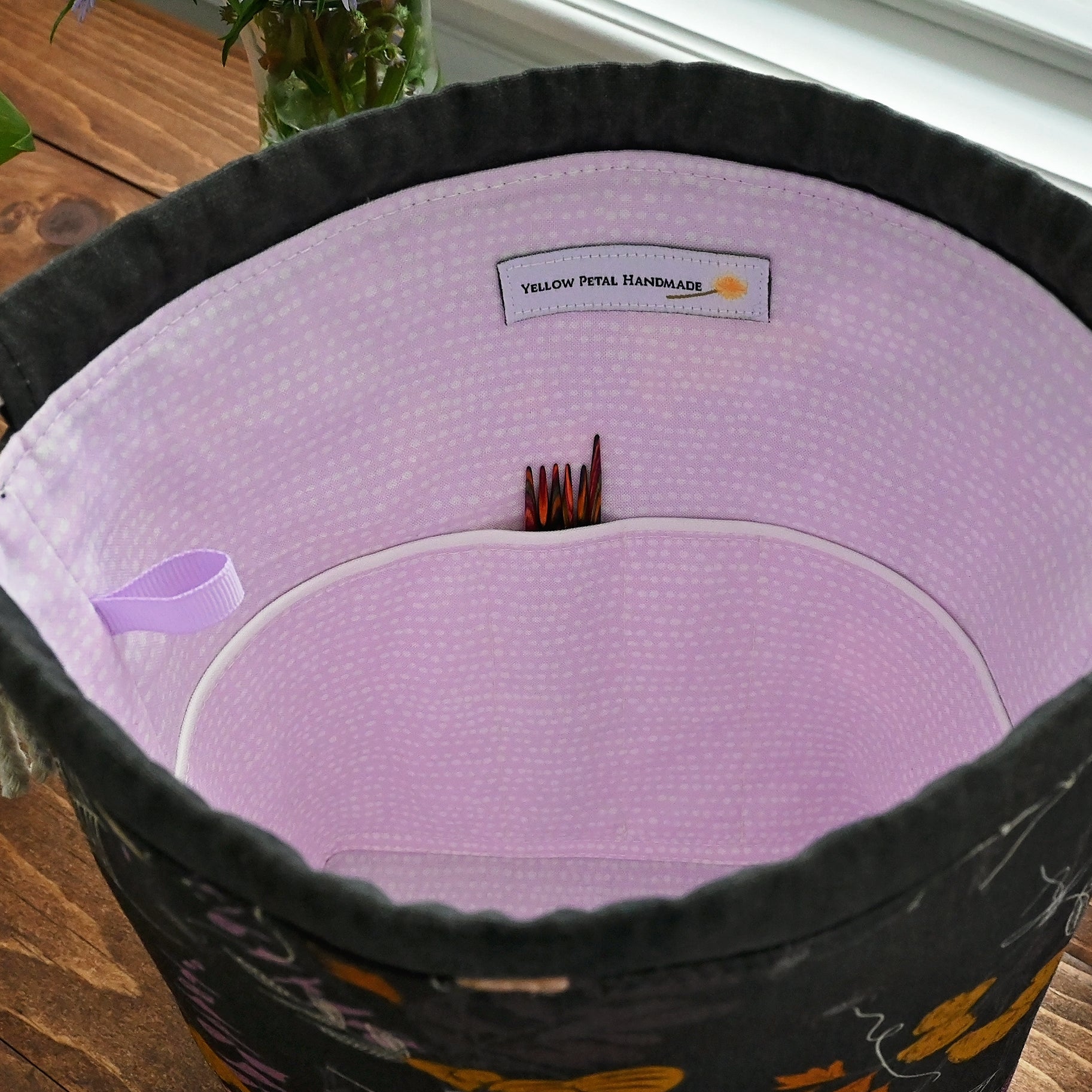 It's made from a Art Gallery Fabric's Cast a Spell collection paired with a grunge black cotton bottom. It's lined in a pretty lilac and white cotton from Dear Stella.