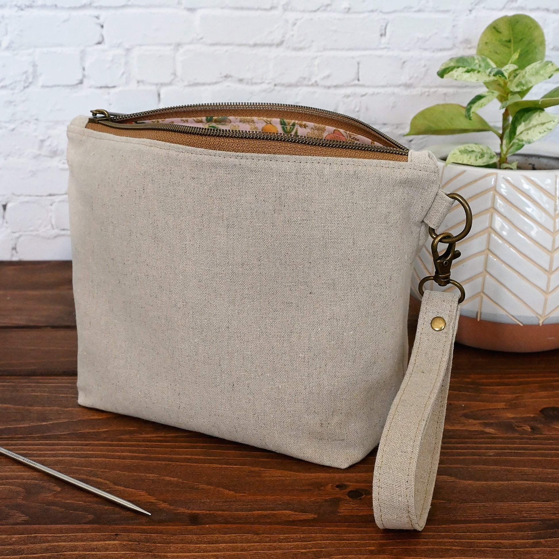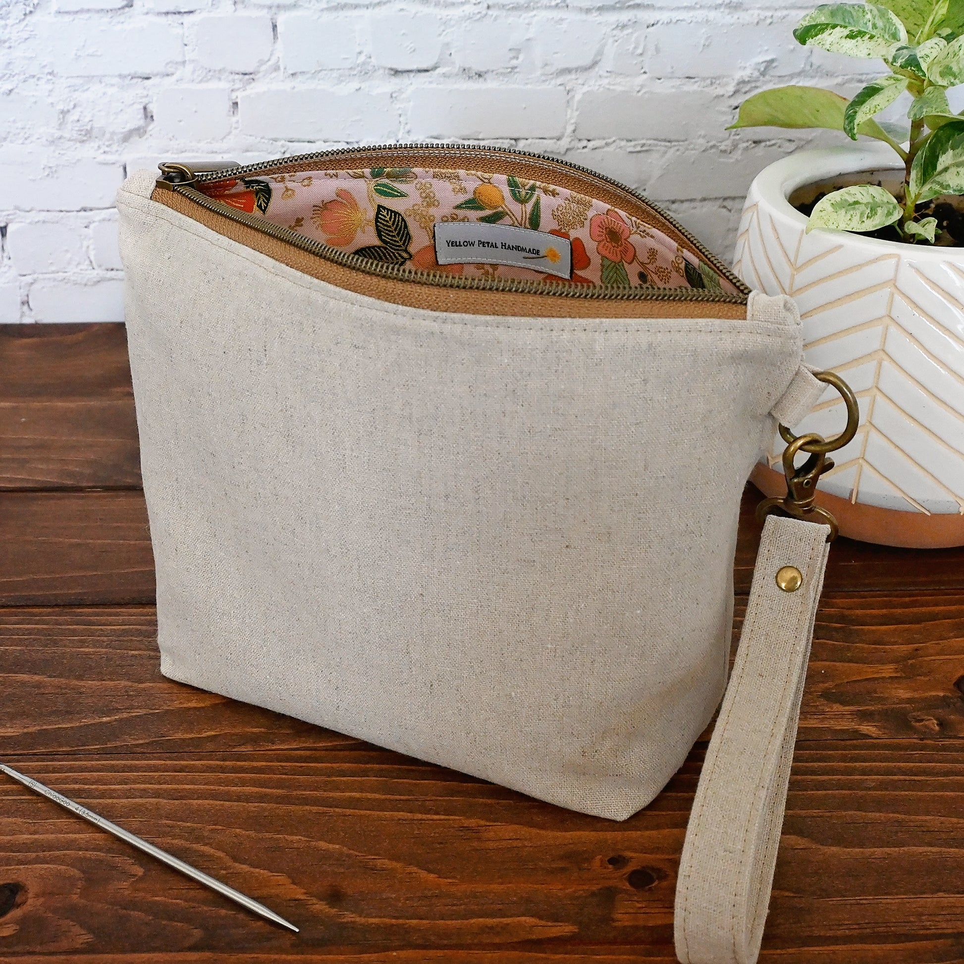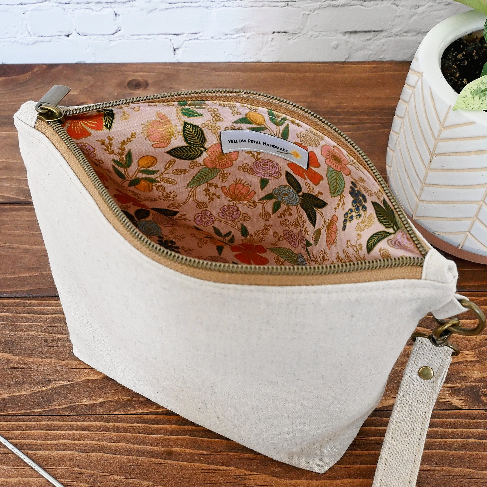 A natural canvas sock pouch with a pretty pink floral lining. Perfect if you love a subtle, classic bag with an eye catching interior. This pouch is lightly reinforced, and it comes with a detachable strap for easy on-the-go use.