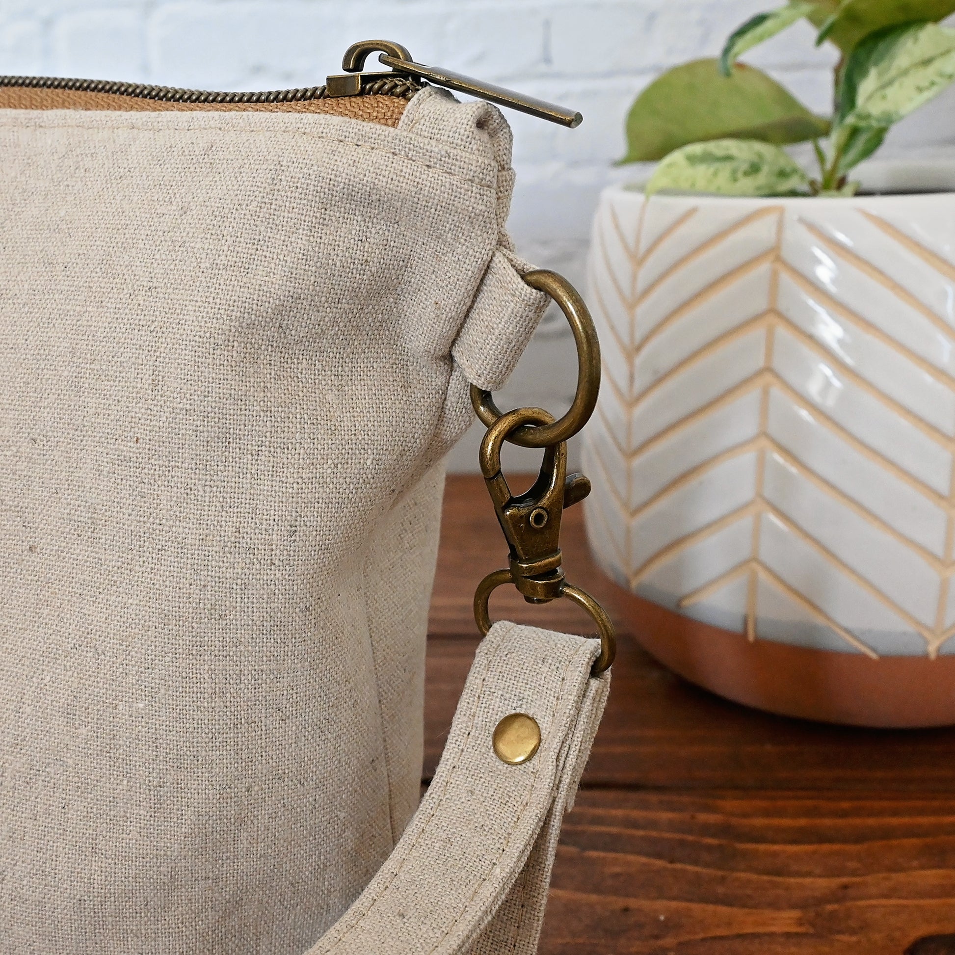 The exterior is a natural canvas by Robert Kaufman and the interior is a pretty blue and pink floral with gold accents from the Orchard Collection by Rifle Paper Co.