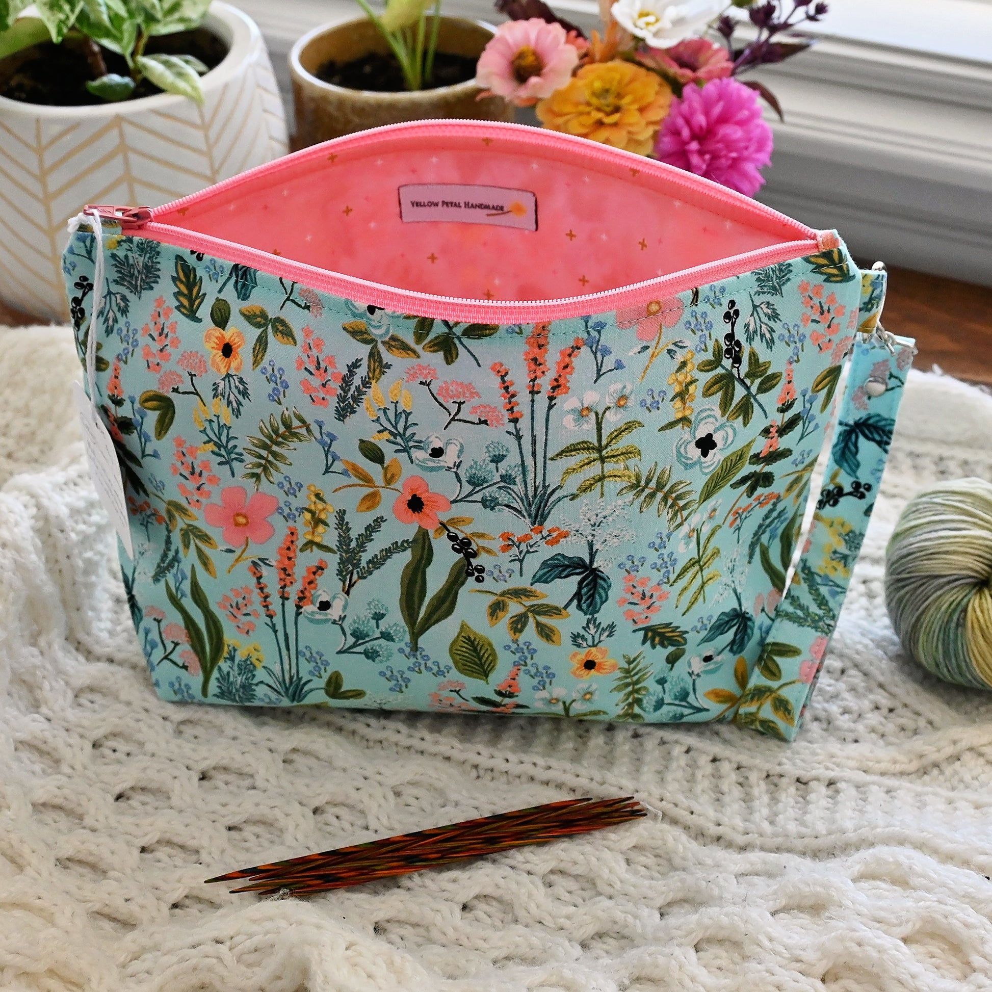 This pretty floral project pouch is made from an aqua floral print and lined with a striking coral cotton. Perfect for socks or other small projects. It features a removable strap and doesn't have any pockets, making it a great 'stow and go' bag.