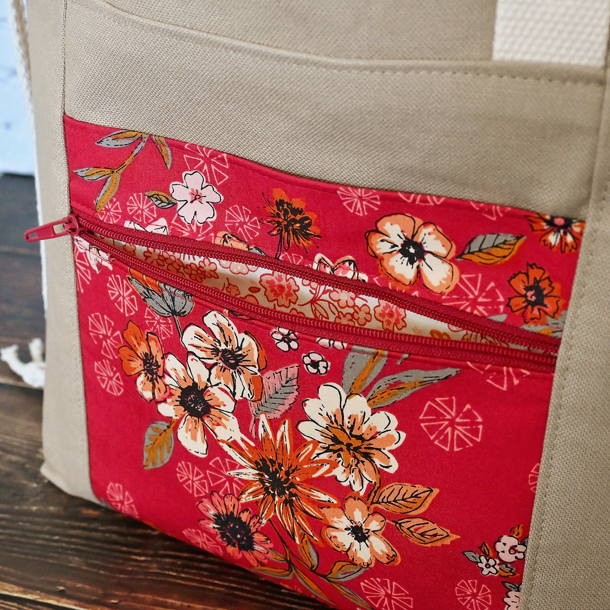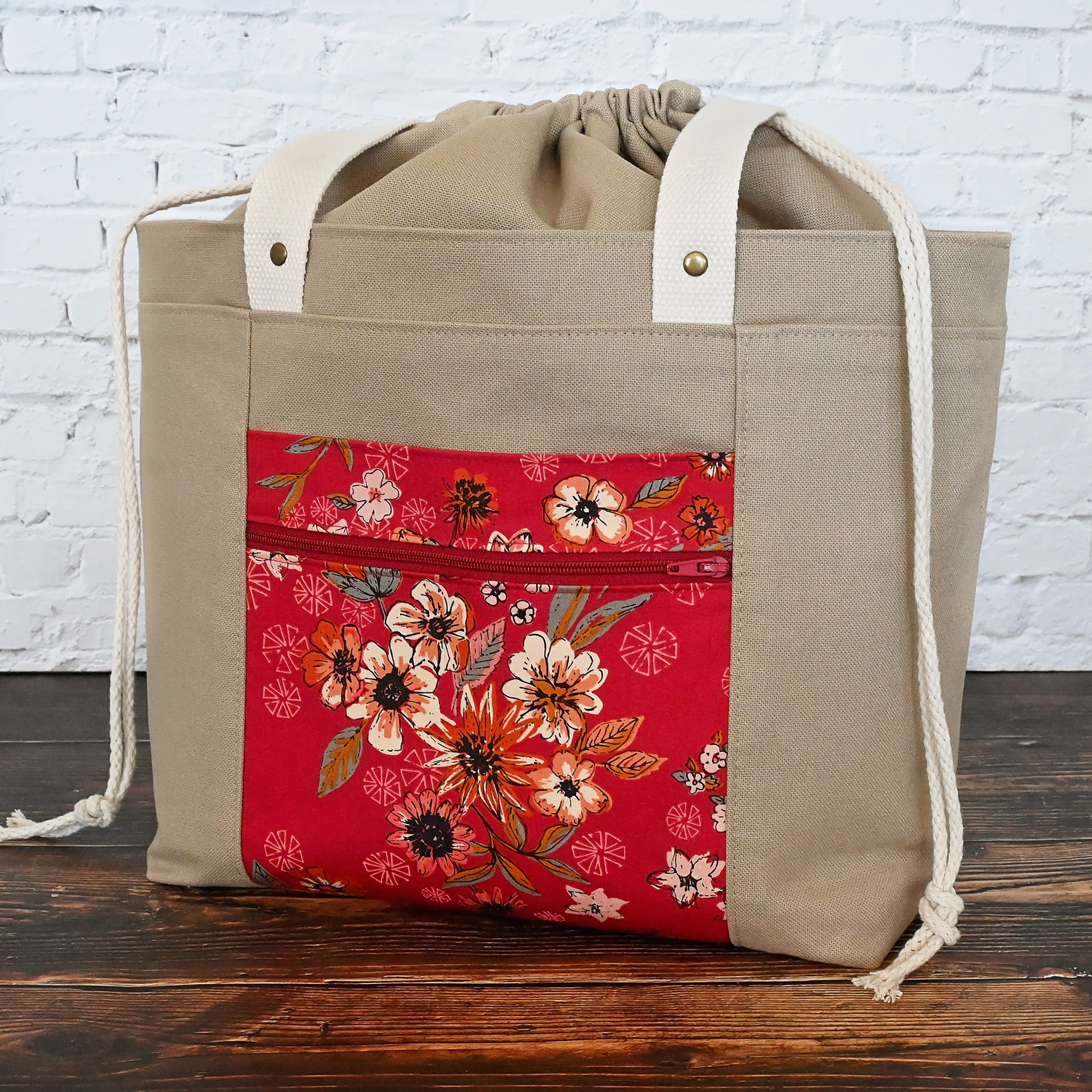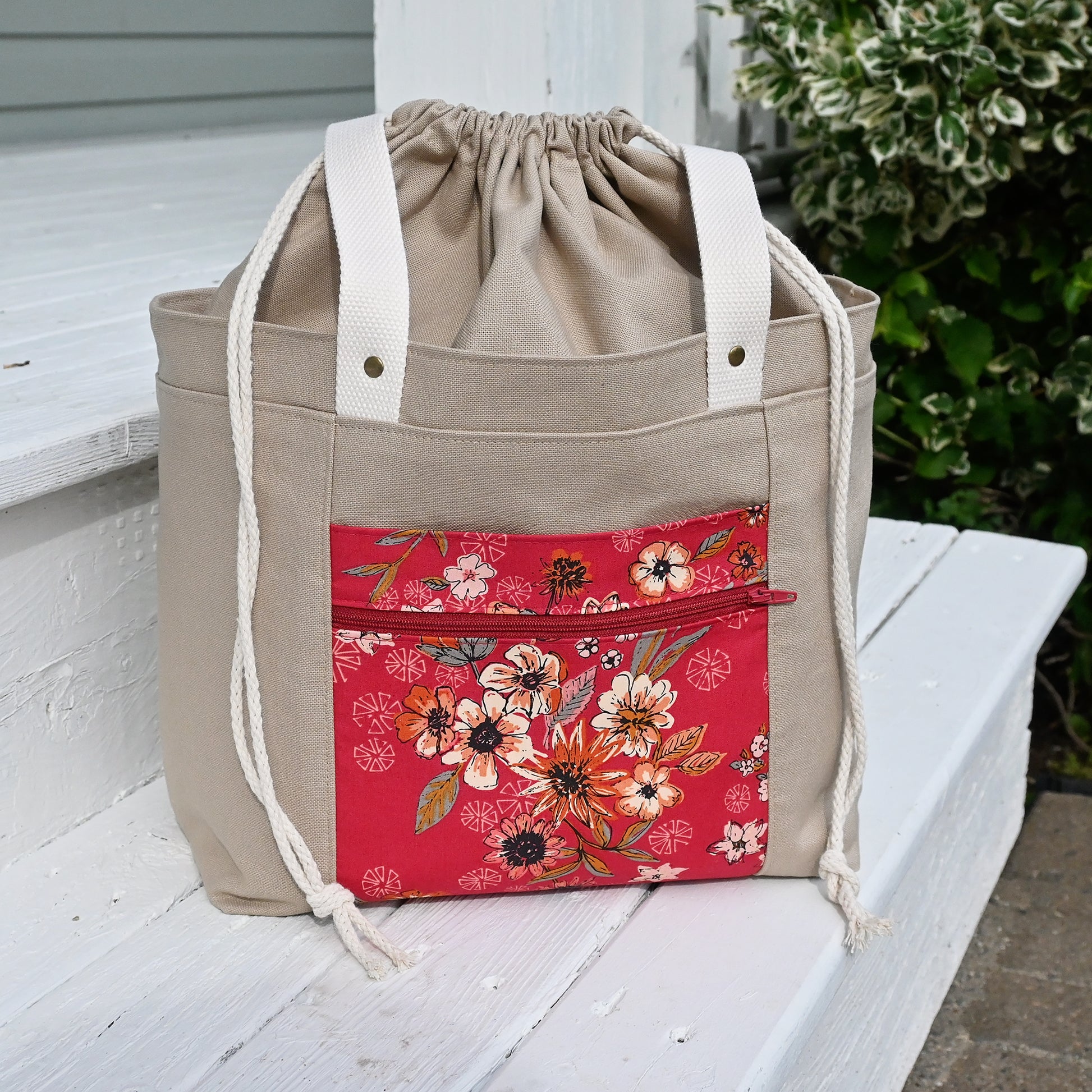 The Kindred Project Tote is thoughtfully designed for makers who love beauty and function in equal measure. Made from a sturdy beige cotton canvas and paired with striking premium cottons from Art Gallery Fabricsβ Kindred Collection, this tote features warm reds, creams, and peachy hues.