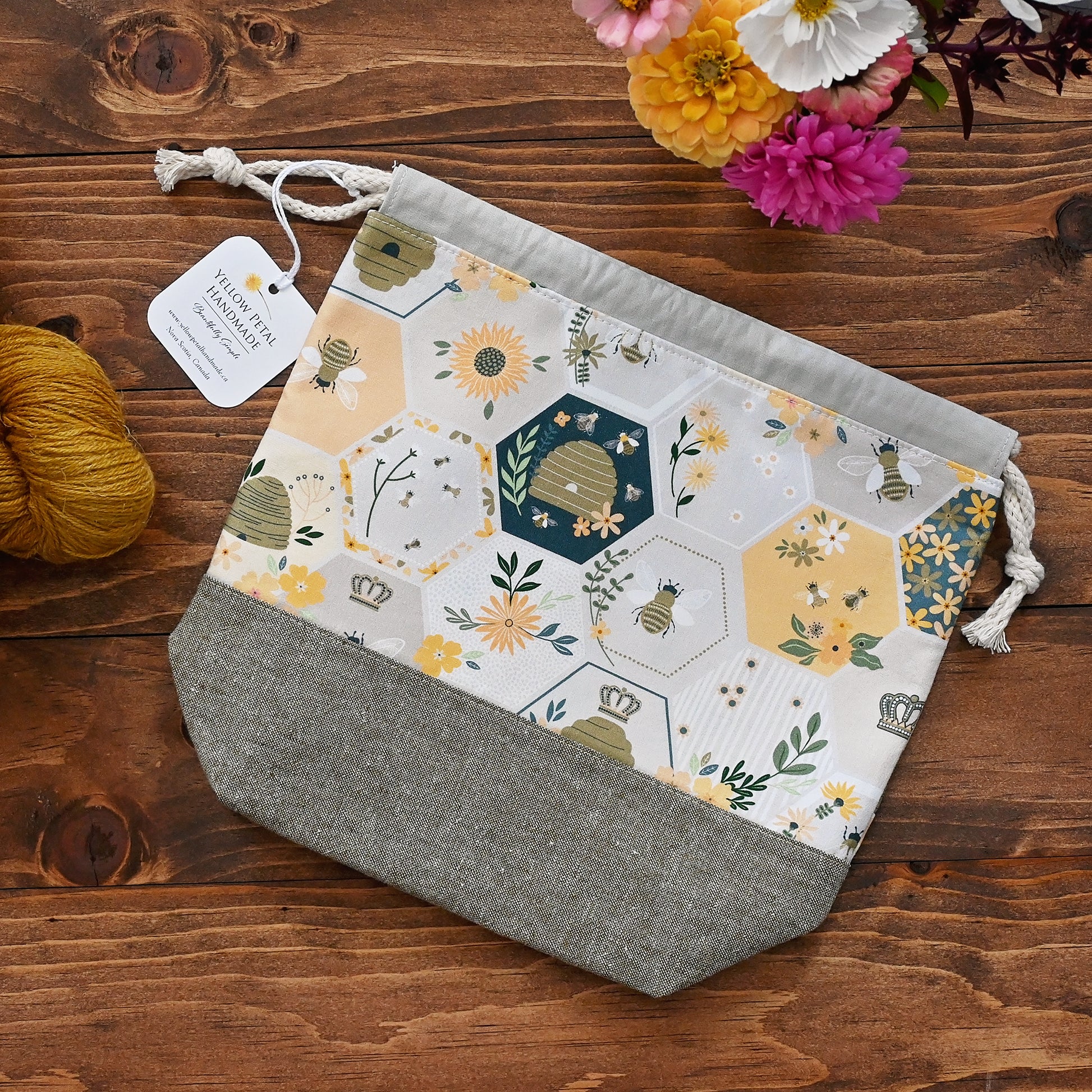 This bag is ideal for smaller projects such as socks and hats. It's structured enough to stand on its own, but also flexible enough to cinch closed with a double drawstring. It measures approximately 10" tall by 9.5" wide and has a 3.5" boxed bottom and has pockets for convenient storage!