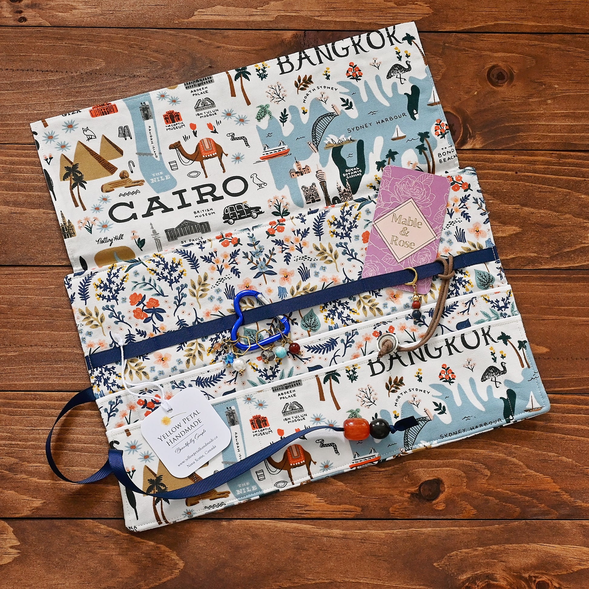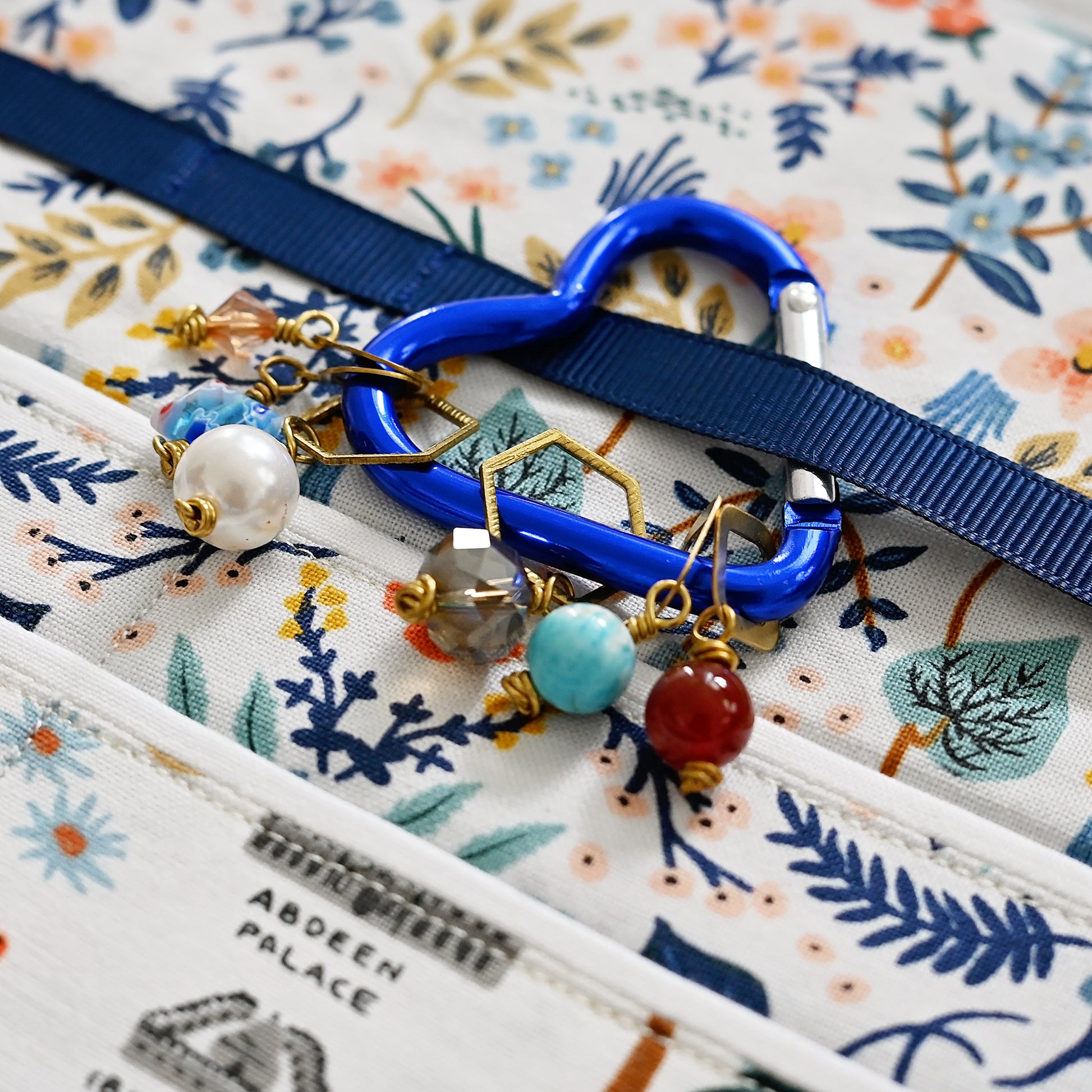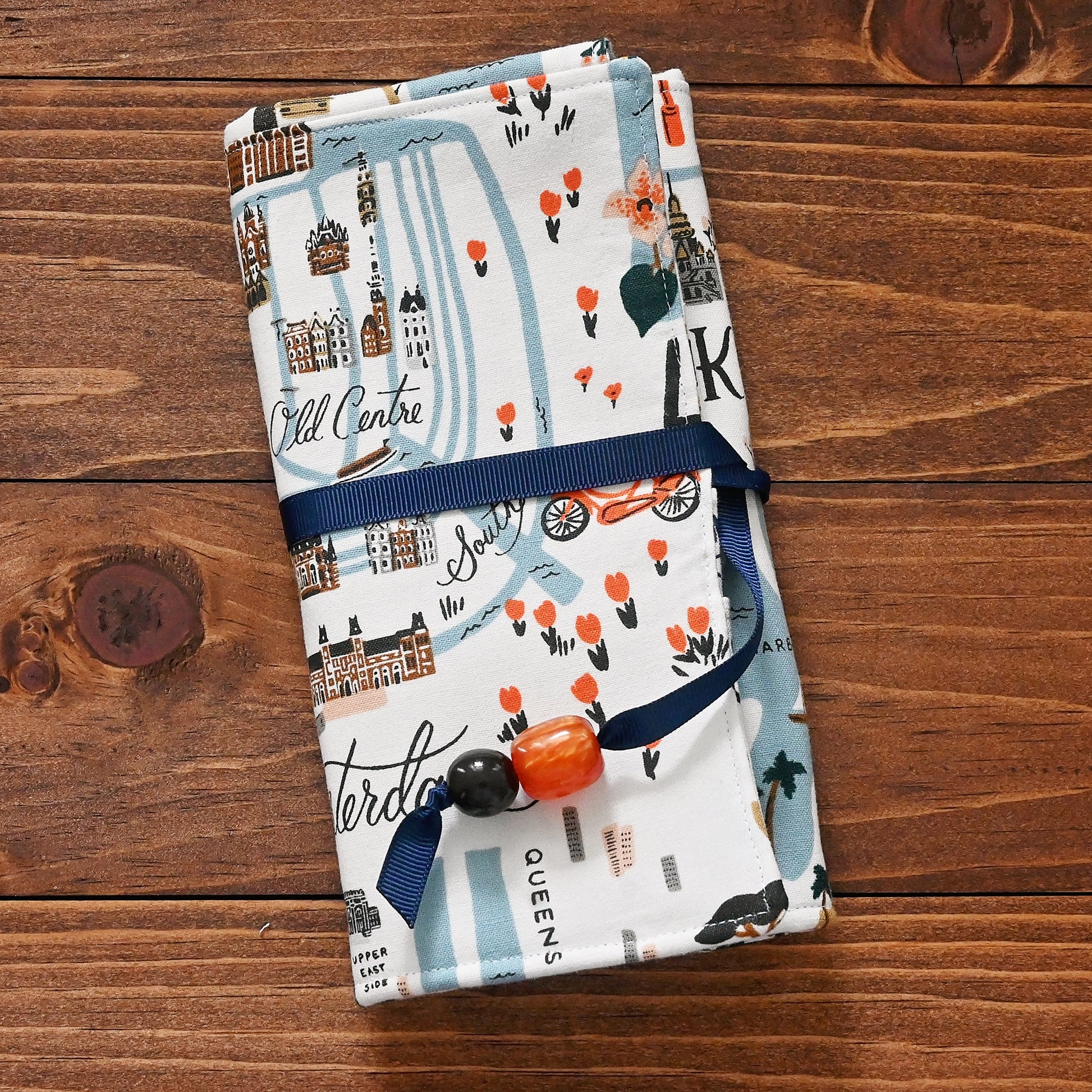 Each wrap is made from designer fabrics and has a thoughtful array of pockets, a beautifully coordinated beaded closure, a one-of-a-kind collection of stitch markers and a gorgeous matching progress keeper. This wrap even comes with a handy moveable magnet to secure your tapestry needles.