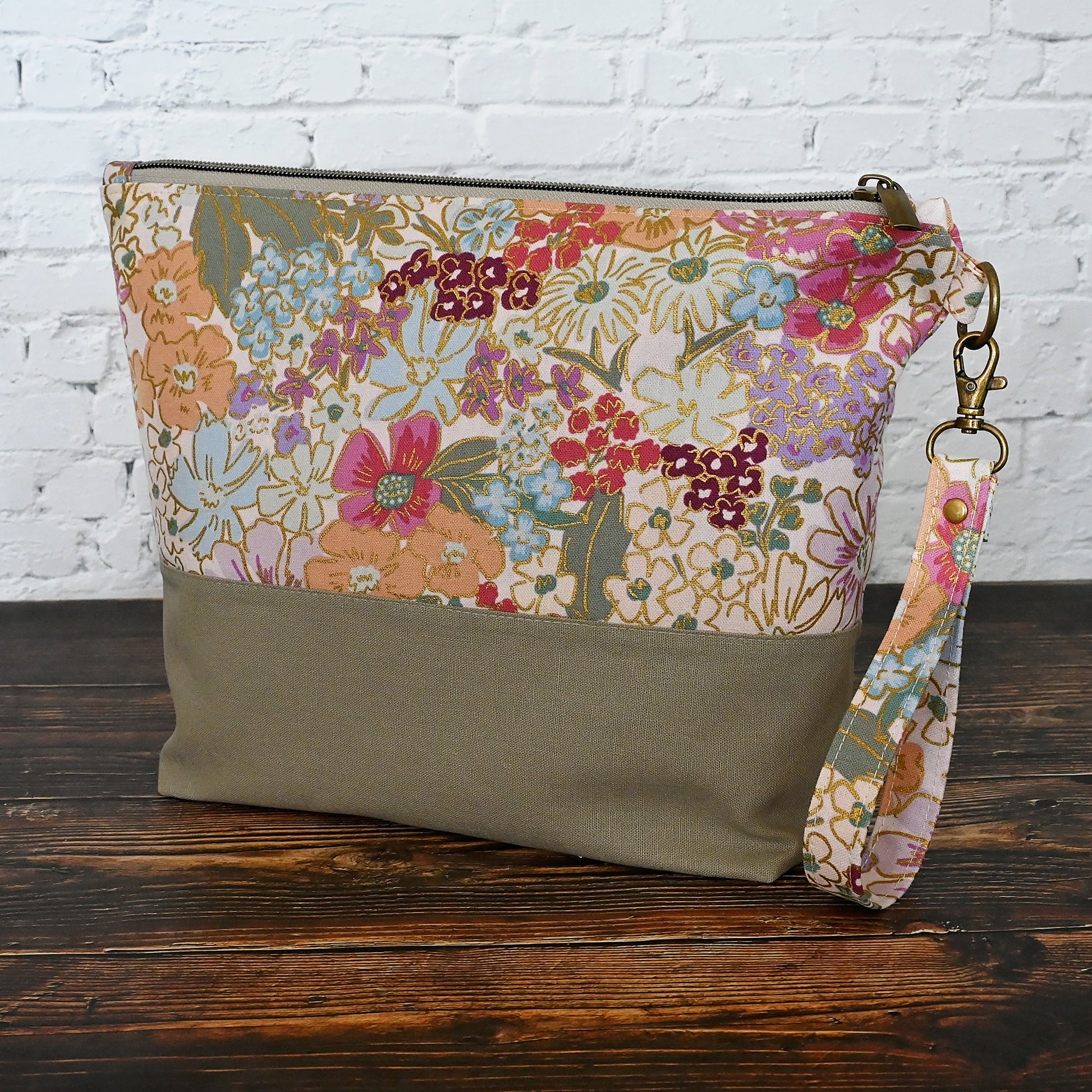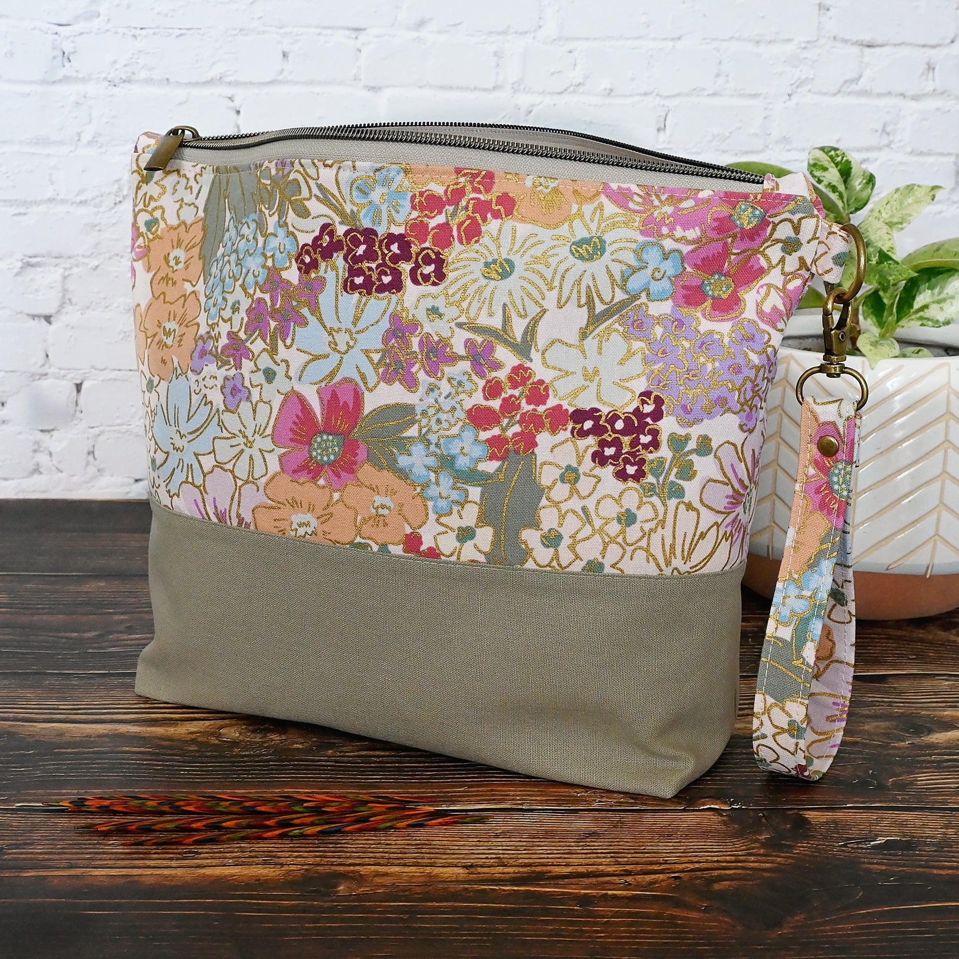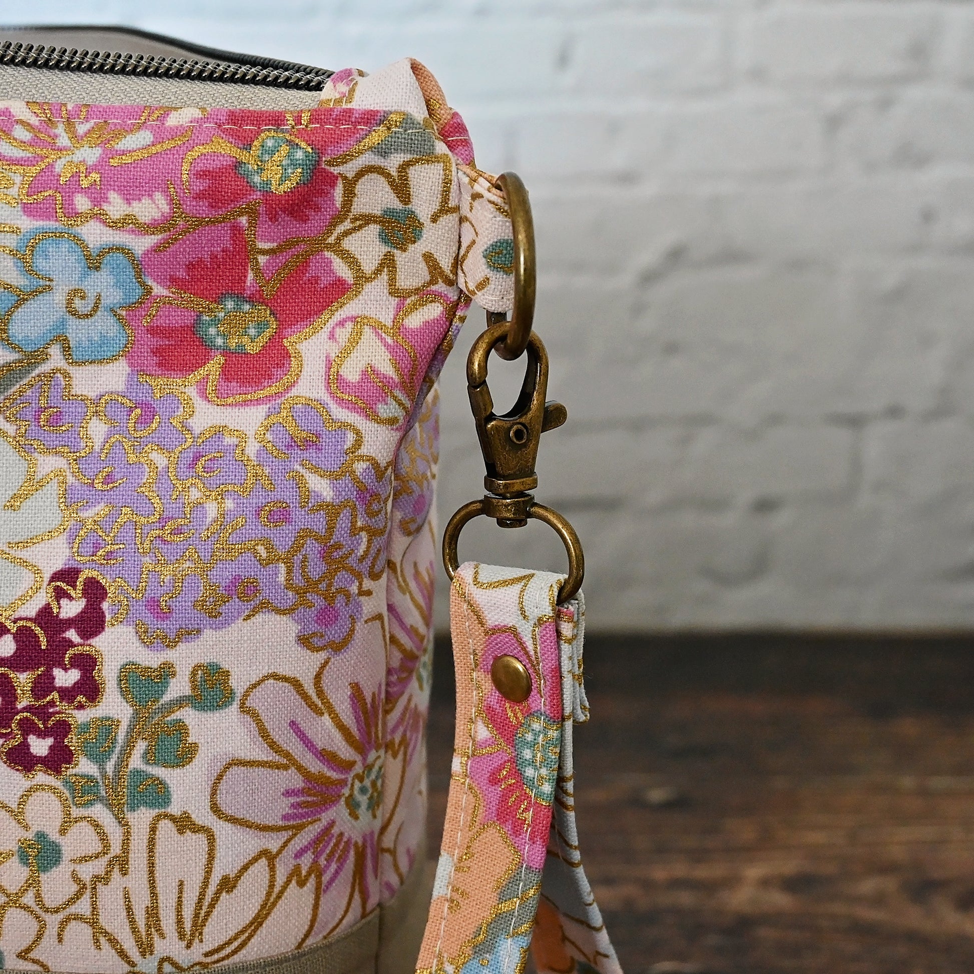 Made from the beautiful English Rose canvas with striking metallic details - new from Rifle Paper Co. It's paired with a putty coloured linen from Robert Kaufman. The interior is a pale blush organic cotton with pockets in English Rose cotton.