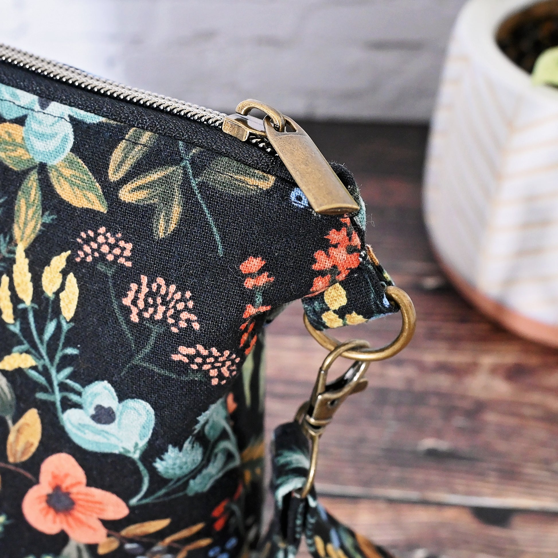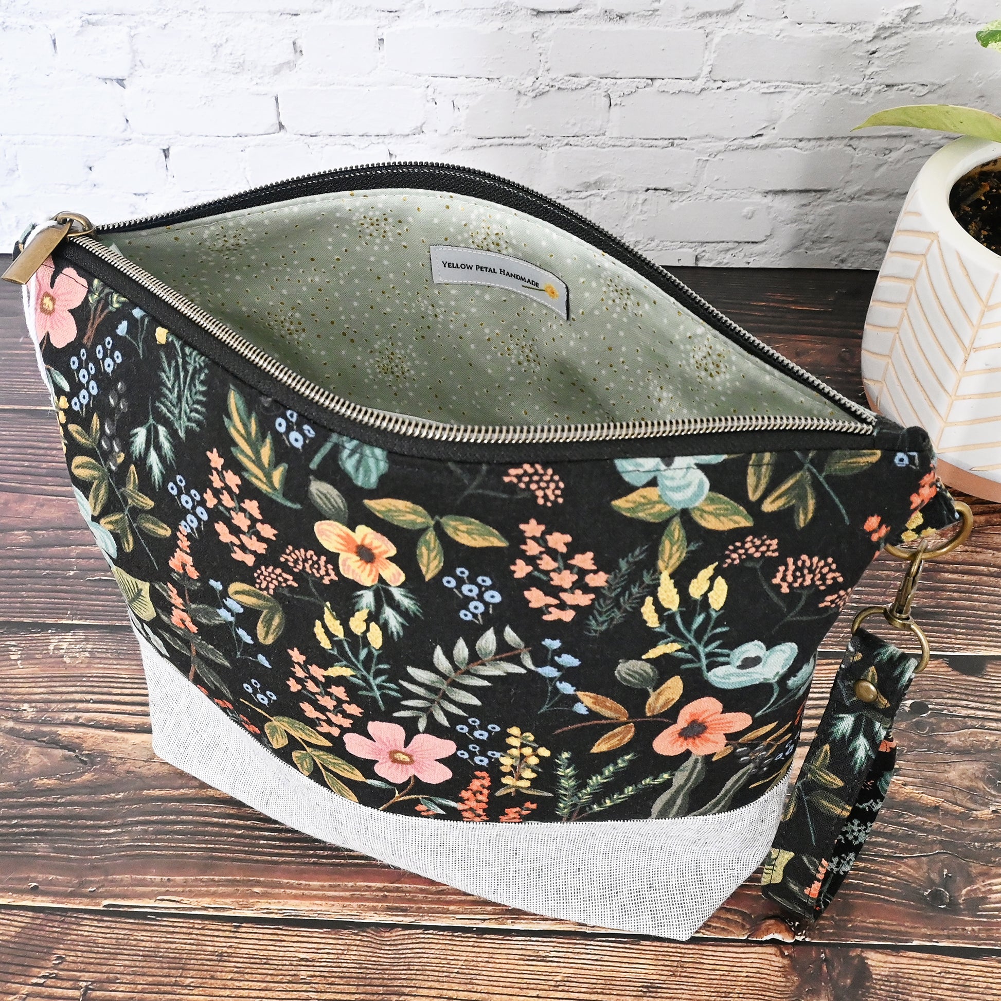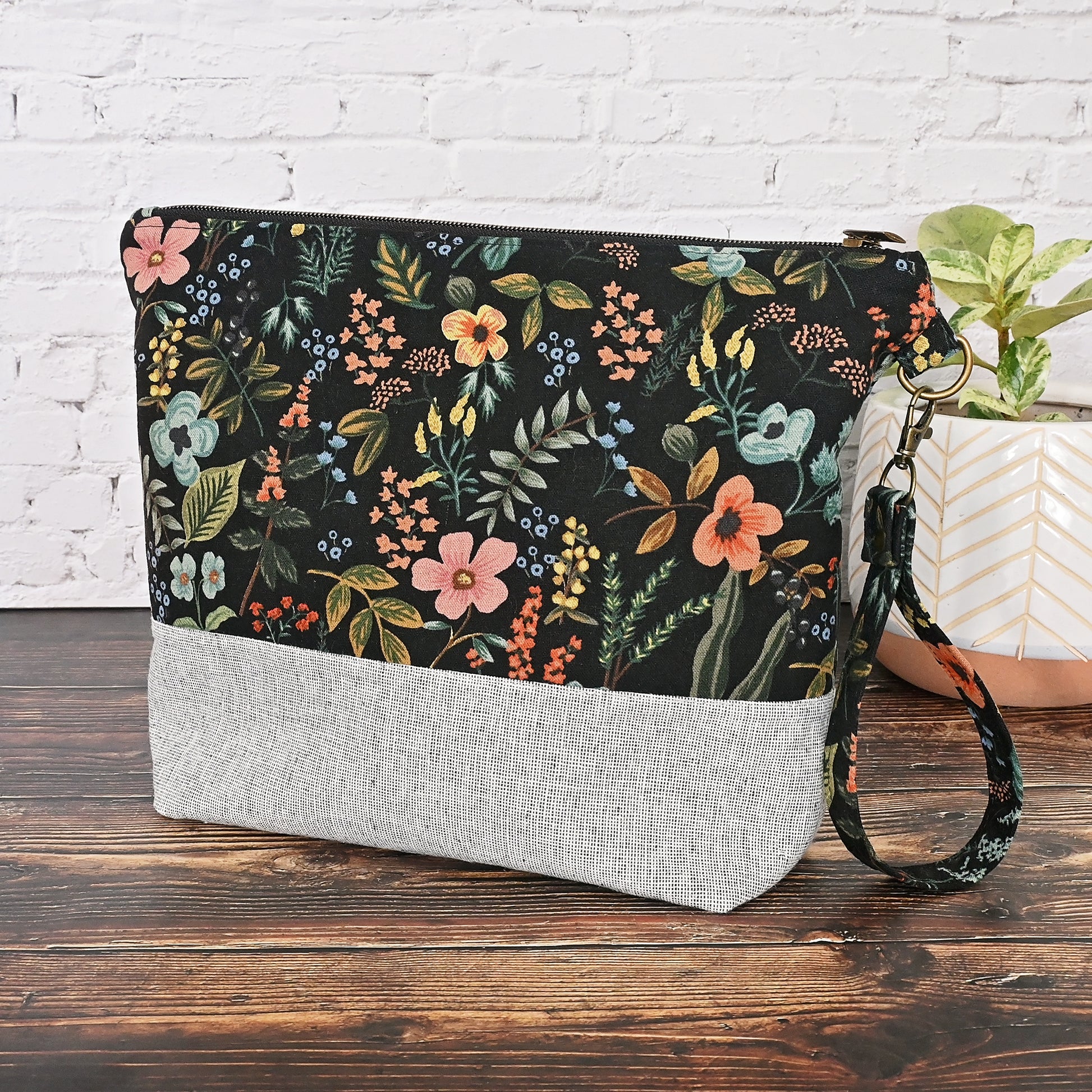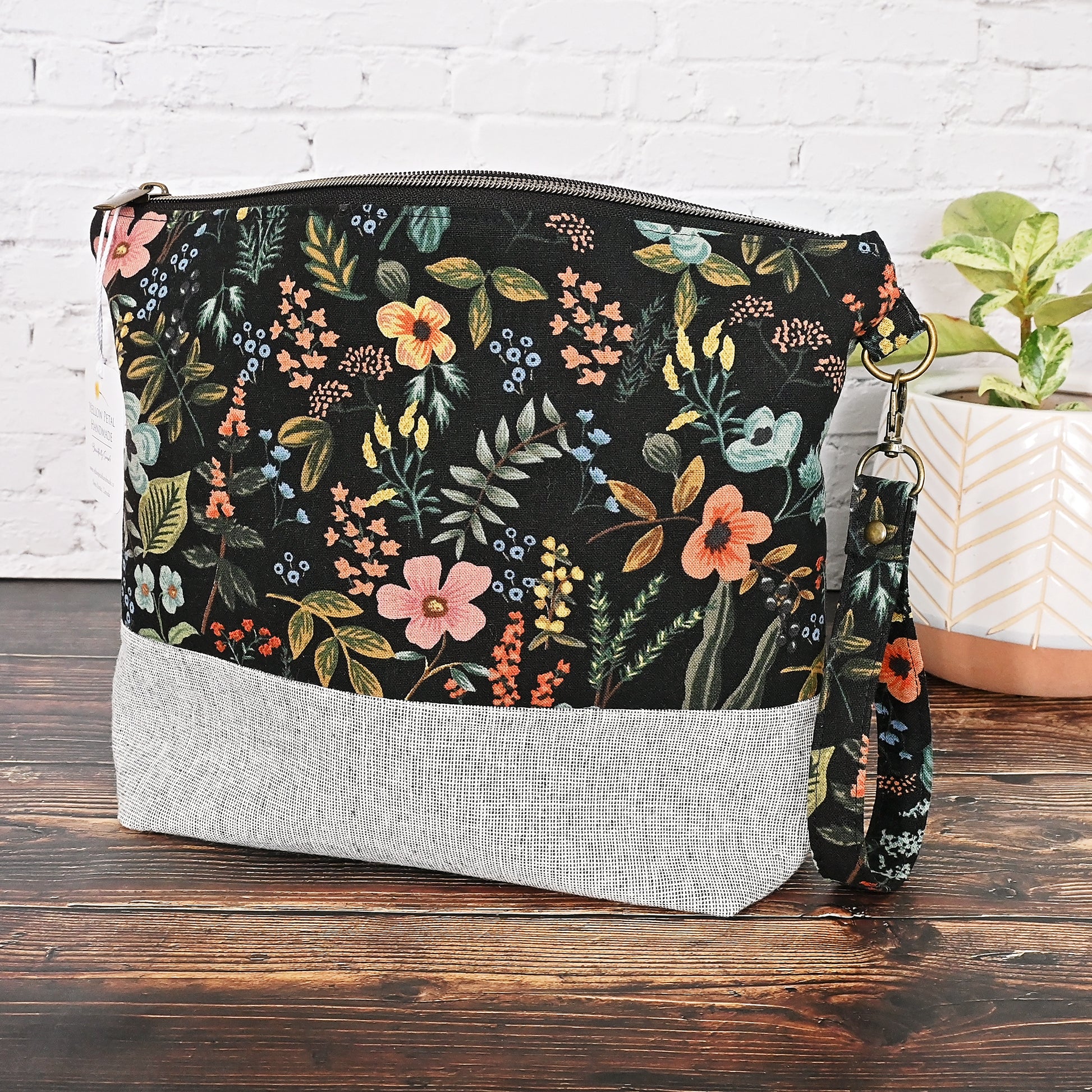 Both are made from canvas from the Amalfi Collection by Rifle Paper Co and paired with a homespun linen from Robert Kaufman's Essex collection. The interior is made with a pretty blue-green cotton with gold accents by Rifle Paper.